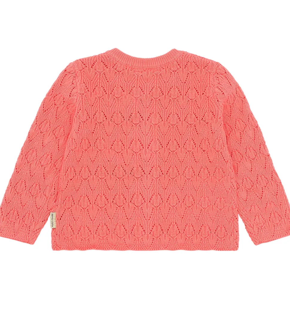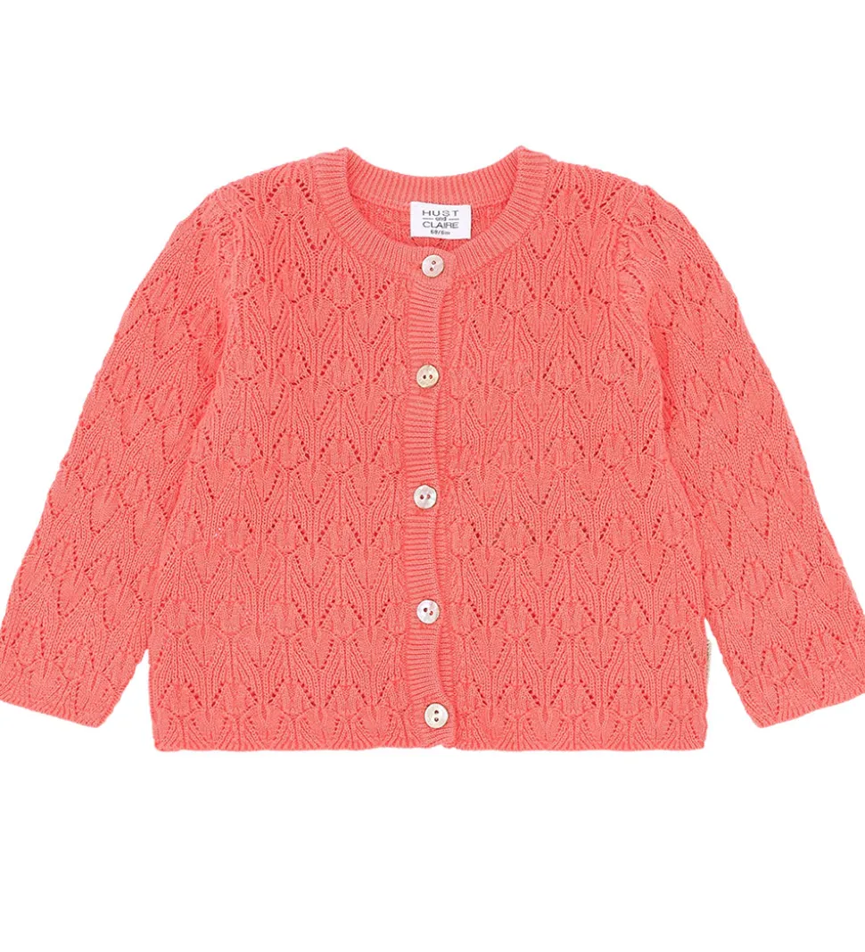 Skøn Hust and Claire cardigan i en stærk koral farve med et fint strikket hulmønster. Cardiganen har et elegant design, der tilføjer et charmerende touch til enhver påklædning.