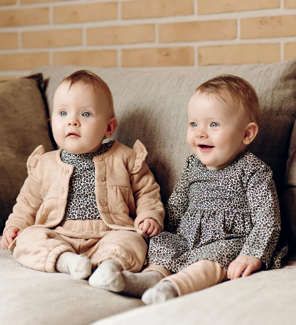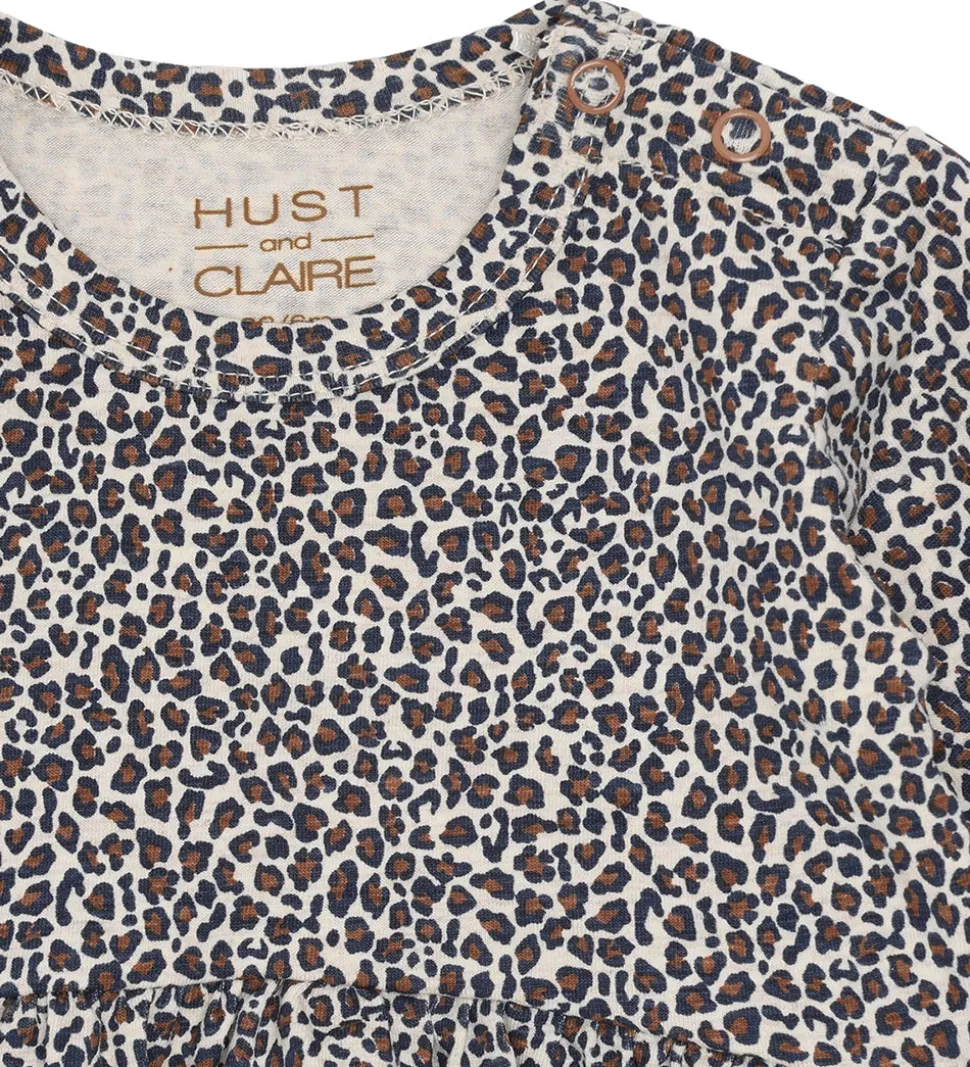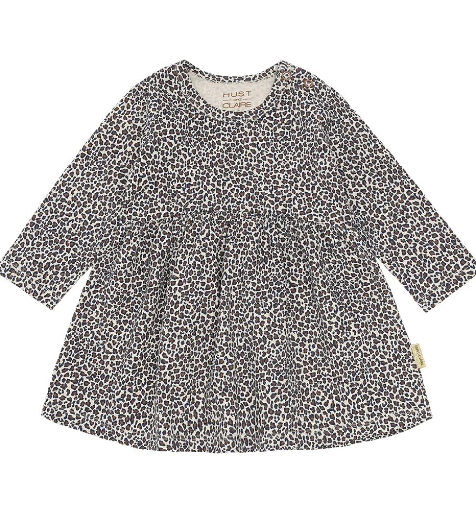 Flot kjole fra Hust and Claire i et leopardmønstret design. Hust and Claire kjolen har lange ærmer og en rund halsudskæring. Kjolen har en skørtet struktur, der skaber et pænt fald. Farverne på kjolen er nuancer af brun, beige og sort, der tilføjer et moderne og stilfuldt udtryk.