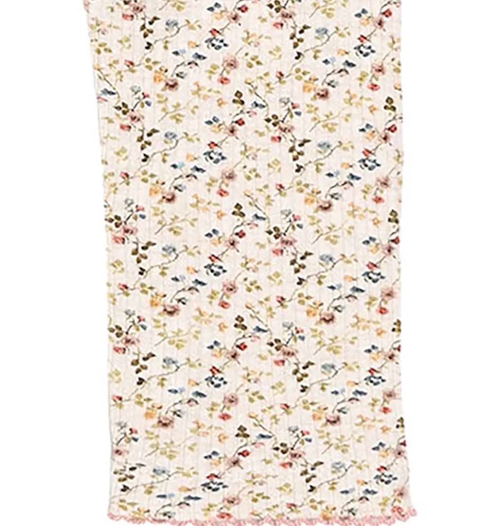 Smukke Hust and Claire leggings i beige med blomsterprint i flotte farver. Leggingsene har ribstruktur og elastisk talje. I benåbningerne er der fine blondekanter i rosa. Leggingsene er fremstillet af økologisk bomuld og modal.