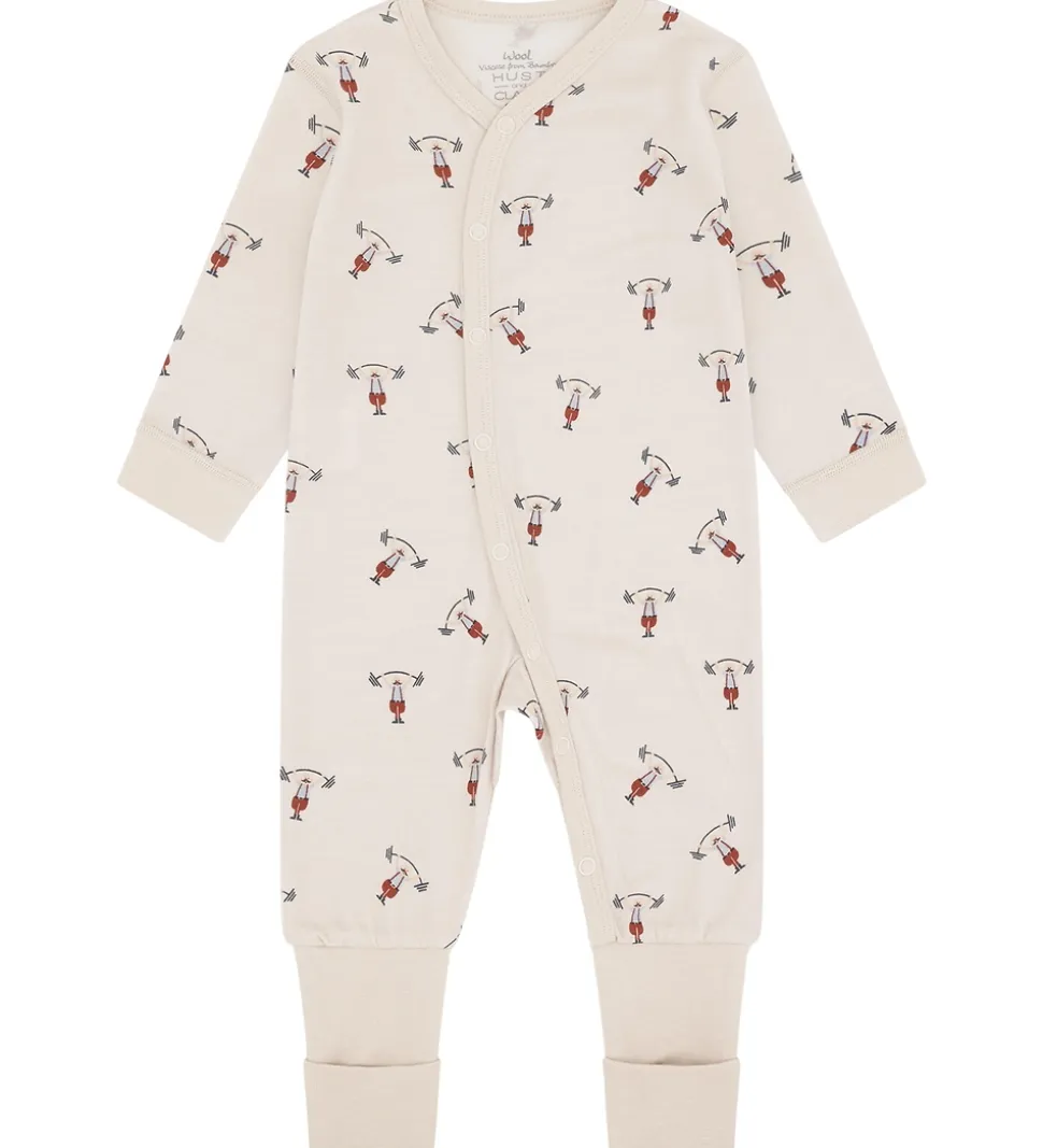 Sjov Hust and Claire natdragt i lys beige med et alloverprint af små vægtløftere. Natdragten har lange ærmer og lukkes foran med praktiske trykknapper fra hagen til venstre fod. Natdragten har lange ben med brede ribkanter og mulighed for ombuk til lukkede fødder. Den er fremstillet i en blød kvalitet af uld og bambus viskose.