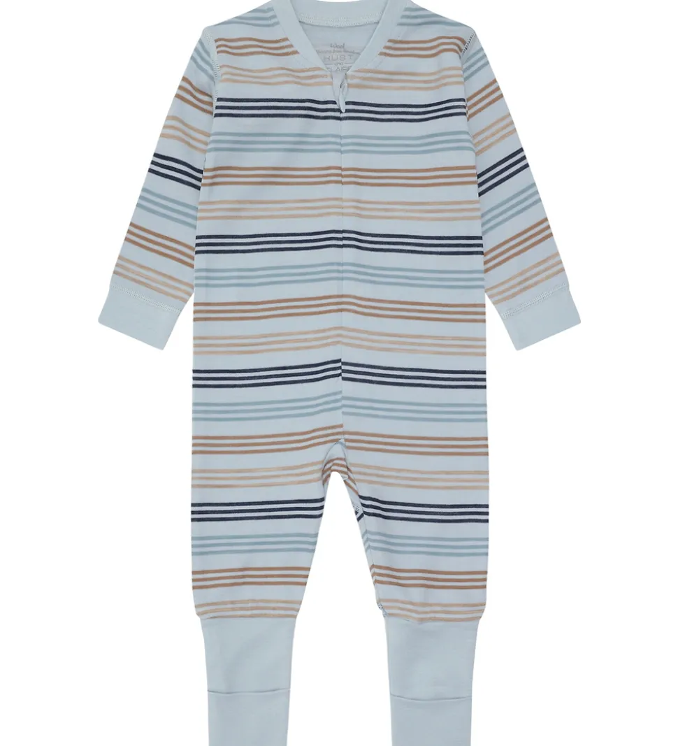 Flot natdragt fra Hust and Claire i lyseblå med stribet design i brune og blå nuancer. Natdragten har en lynlås fra hagen til venstre fod. Den har lange ærmer og lange ben med ribkanter og mulighed for ombuk til lukkede fødder. Natdragten er fremstillet i en blød blanding af uld og bambus viskose.