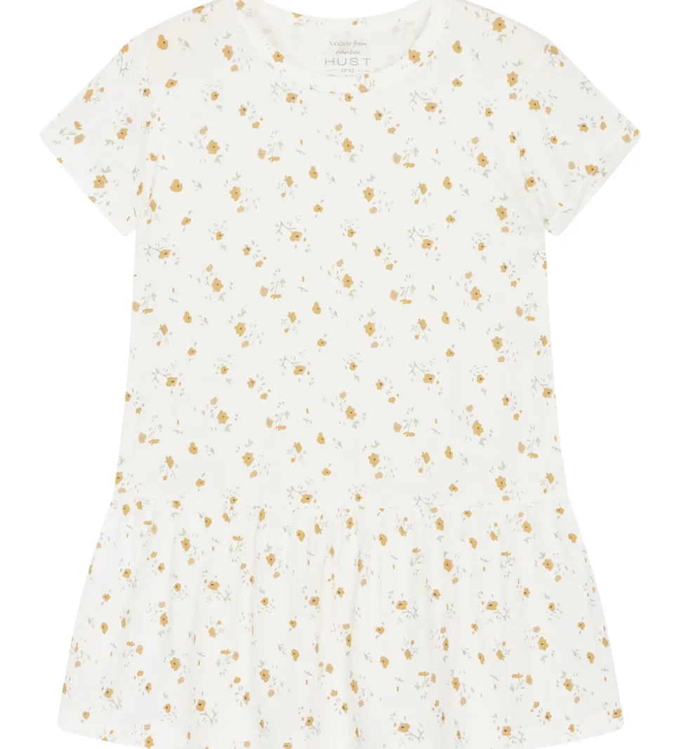 Elegant Hust and Claire natkjole med et blødt design i hvidt dekorativt med små gule blomster over hele stoffet.