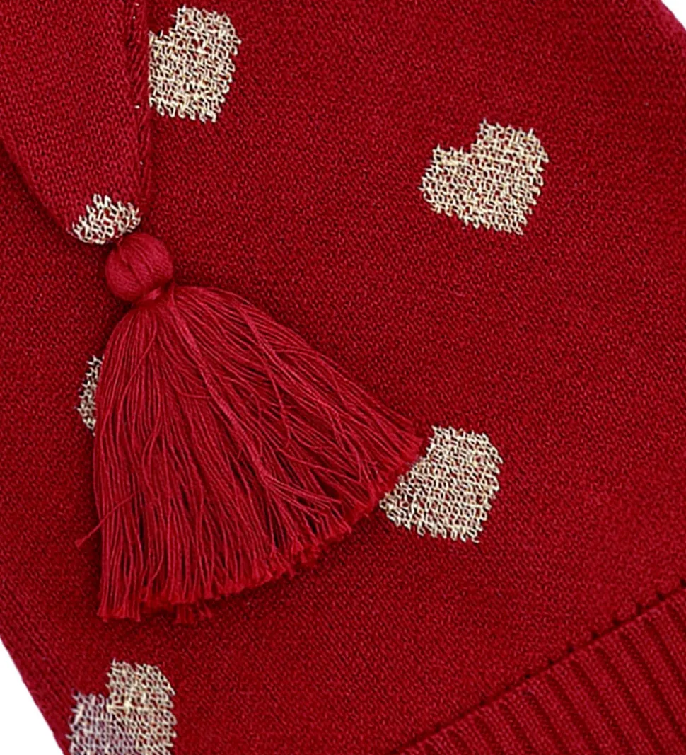 Charmerende Hust and Claire nissehue i en smuk, dyb rød nuance med dekorative hjerter i guld med glimmer. Hust and Claire nissehuen er lavet i en strikket kvalitet, og den afsluttes med en kvast for et klassisk look.