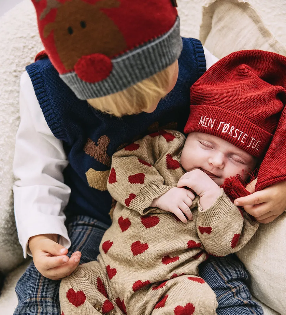 Charmerende Hust and Claire nissehue i en dyb rød farve. Hust and Claire nissehuen har en fin kvast i spidsen og teksten “Min Første Jul” broderet foran i hvid.