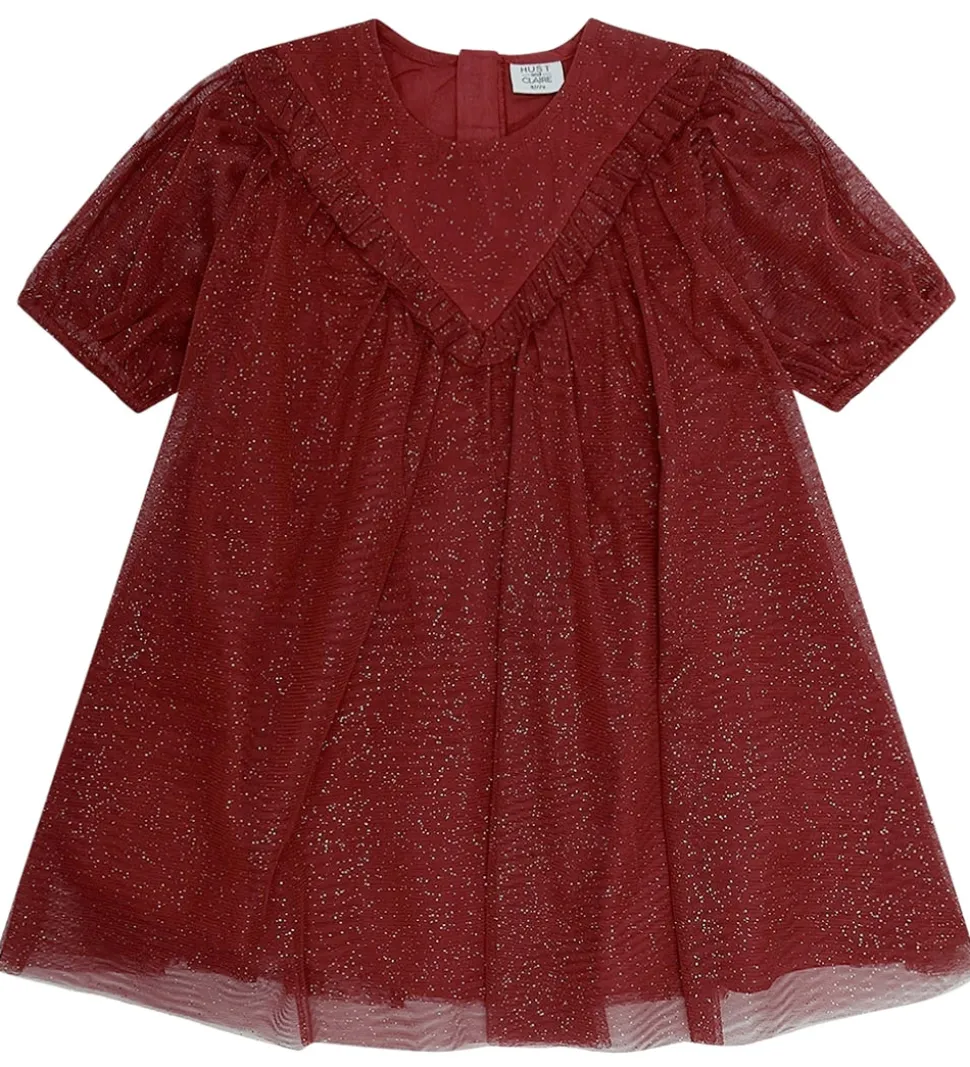 Elegnt Hust and Claire kjole i mørkerødt tyl med guldprikker.