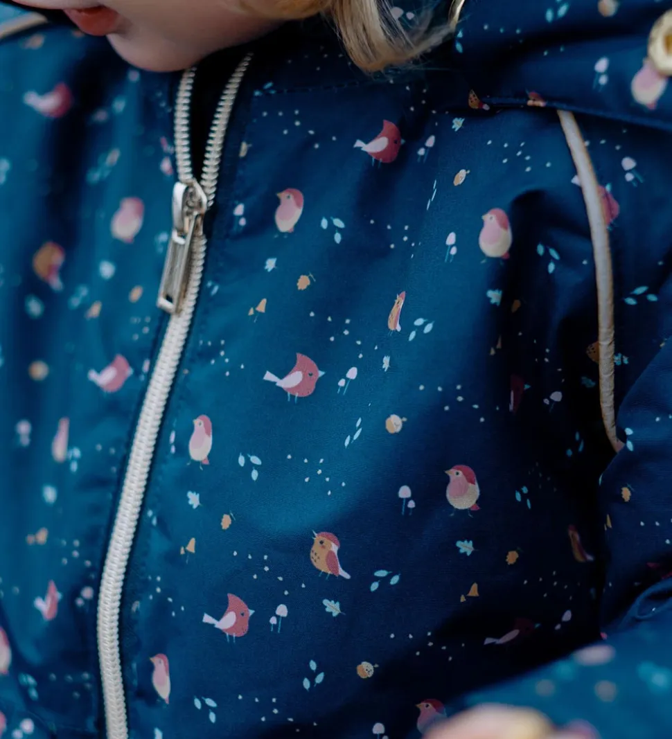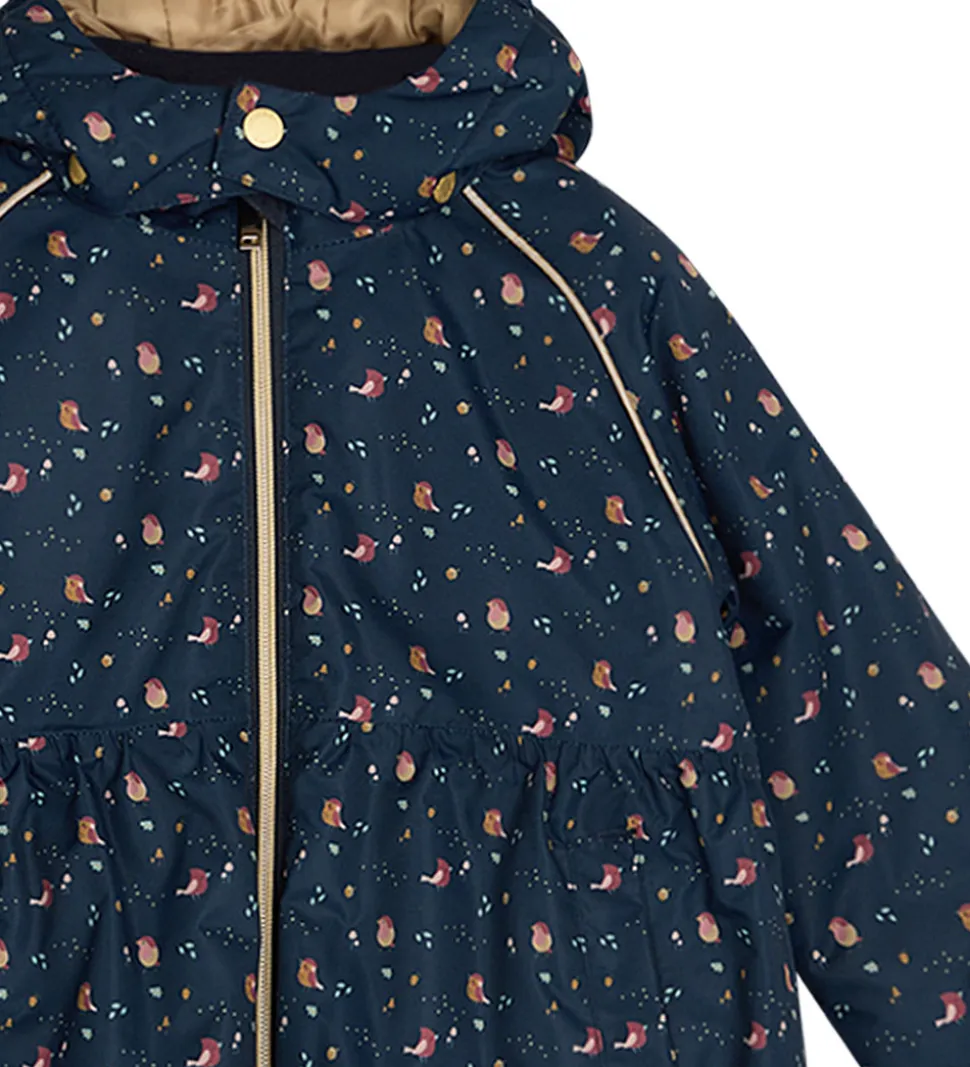 Lækker Hust and Claire vinterjakke i navyblå med et alloverprint af små fugle i rosaog gyldenbrun. Vinterjakken har fine, gyldne trykknapper, lynlås og reflekspipings.