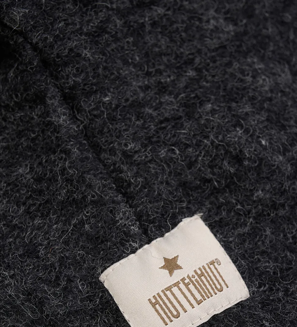 Imponerende Huttelihut elefanthue i en mørkegråmeleret med unikke takker langs kanten. Huttelihut elefanthuen består af to lag og har en rund hovedform med indsyet ribkant ved ansigtsåbningen.