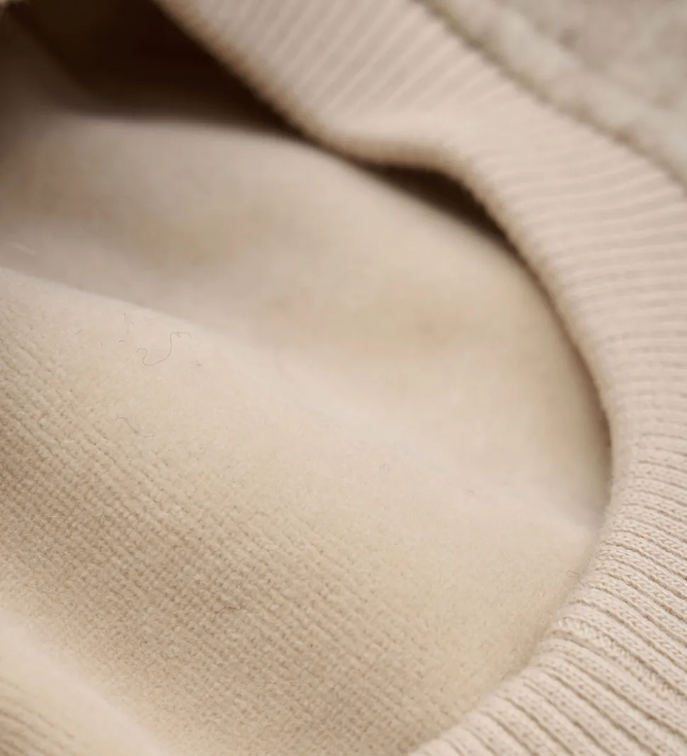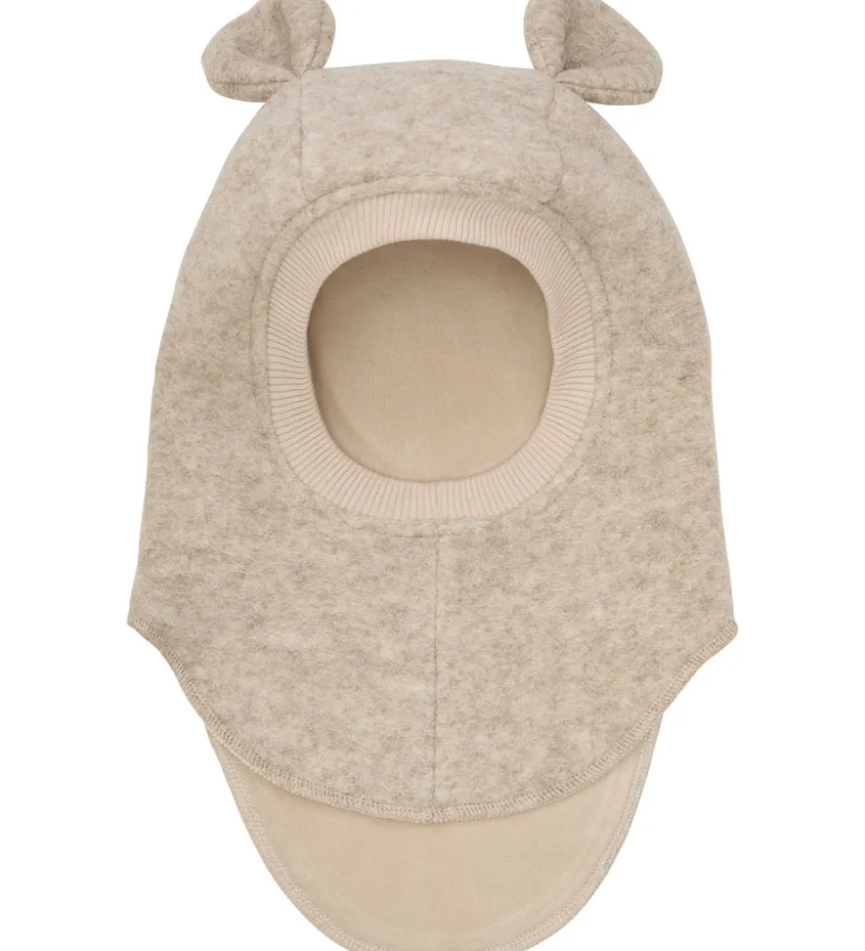 Elegant Huttelihut elefanthue af lunt uldfleece i en meleret lysebeige. Huttelihut elefanthue har en rund hovedform og er dekoreret med to ører op toppen. Elefanthuen består af to lag, og har en smart ribkant ved ansigtsåbningen.