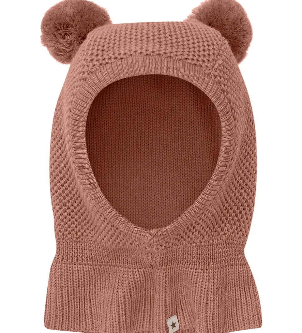 Behagelig Huttelihut elefanthue strikket i en mørk rosa med et flot mønster. På toppen har elefanthuen to kvaster.