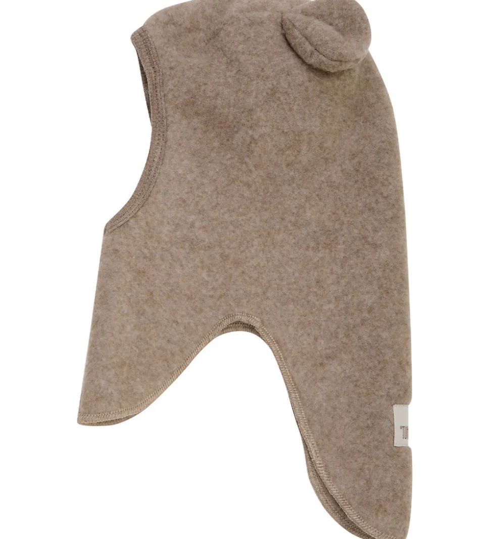 Fin Huttelihut elefanthue i ensfarvet, meleret mørkebeige af lunt uldfleece. I nakken er der en logopatch.