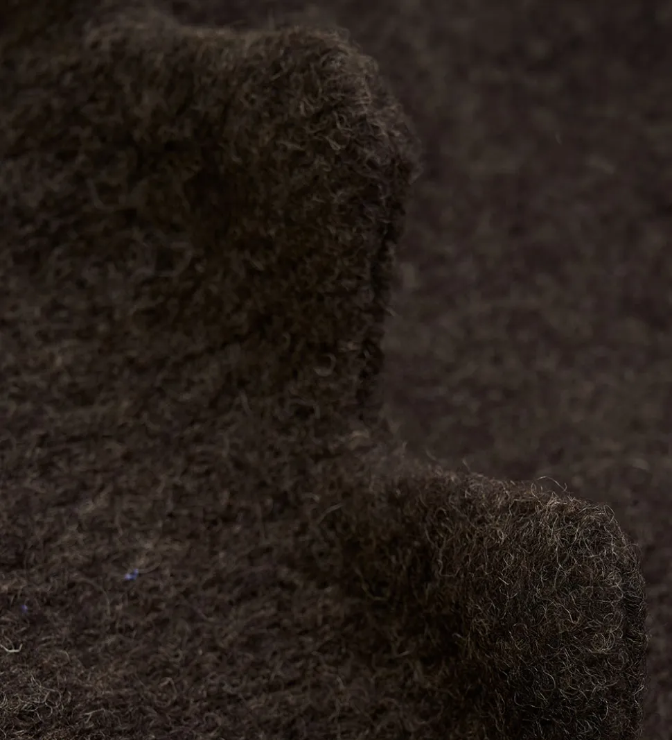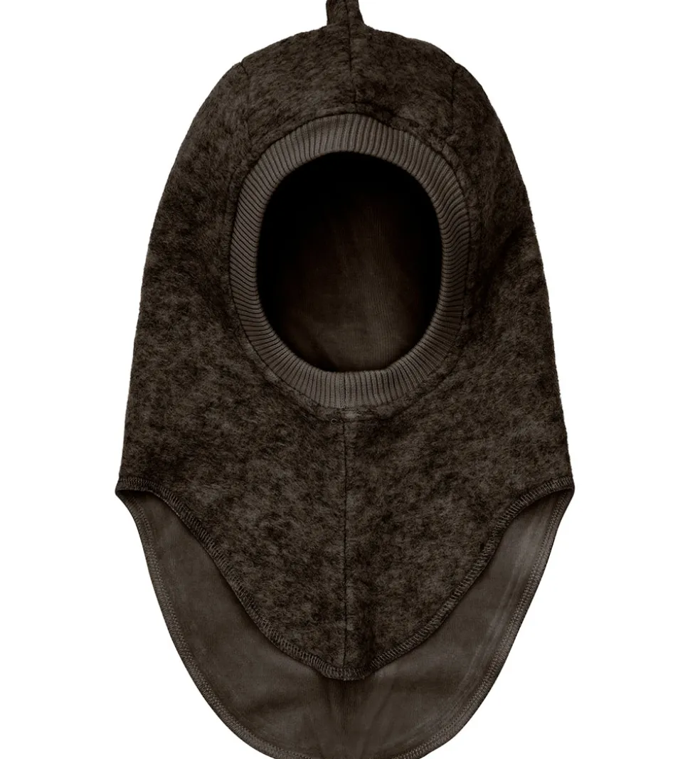 Elegant Huttelihut elefanthue af lunt uldfleece i meleret mørkebrun. Huttelihut elefanthuen består af to lag og har en rund hovedform med takker langs kanten.