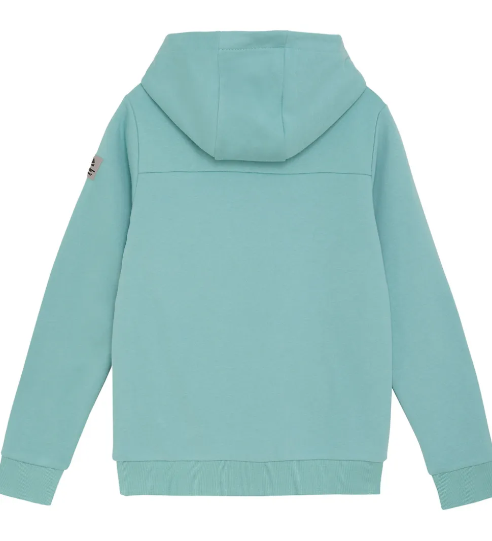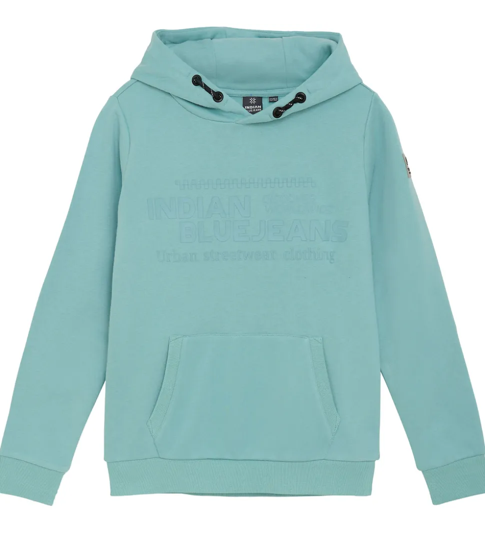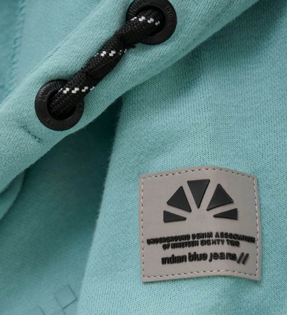 Stilfuld hættetrøje fra Indian Blue Jeans i turkis sweat. Hættetrøjen har et subtilt gummiprint på fronten i en mørkere nuance. Denhar en rummelig kængurulomme og en hætte med dekorative snører i sort. Ribkanter ved håndled og talje fuldender hættetrøjens design. På indersiden har hættetrøjen blødt, børstet bomuld.