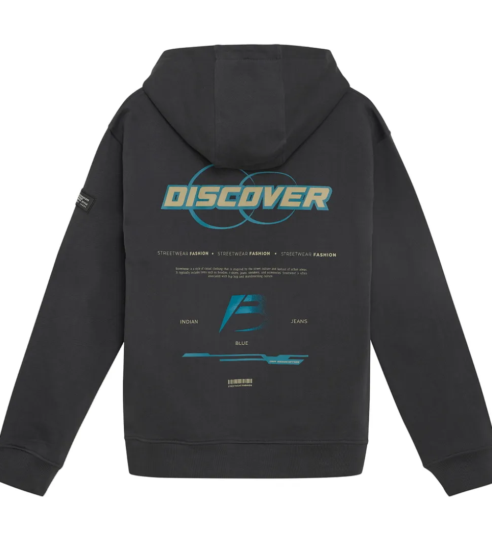 Smart Indian Blue Jeans hættetrøje i koksgråt sweat, og på ryggen er der et stort tekstprint i blå og beige nuancer. Indian Blue Jeans hættetrøjen har en fast hætte medet bomuldsfor, og den har lange ærmer og brede ribkanter.