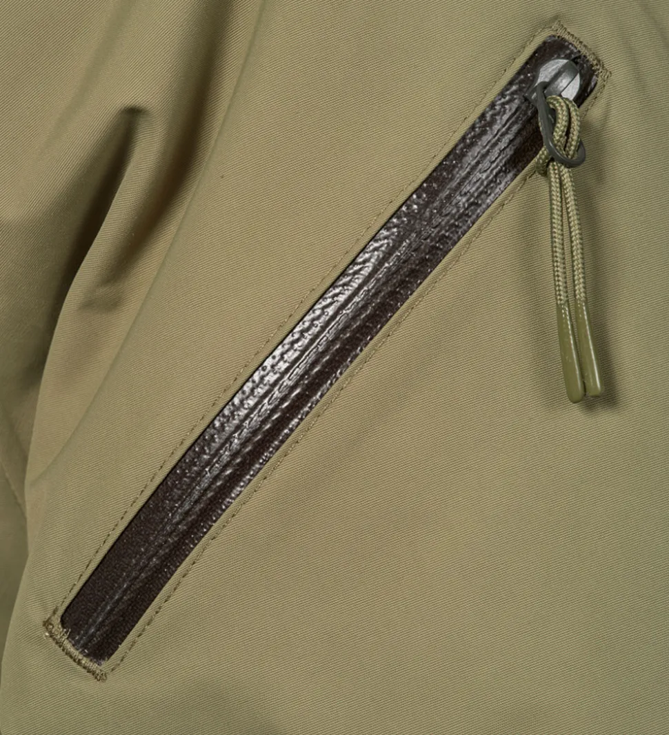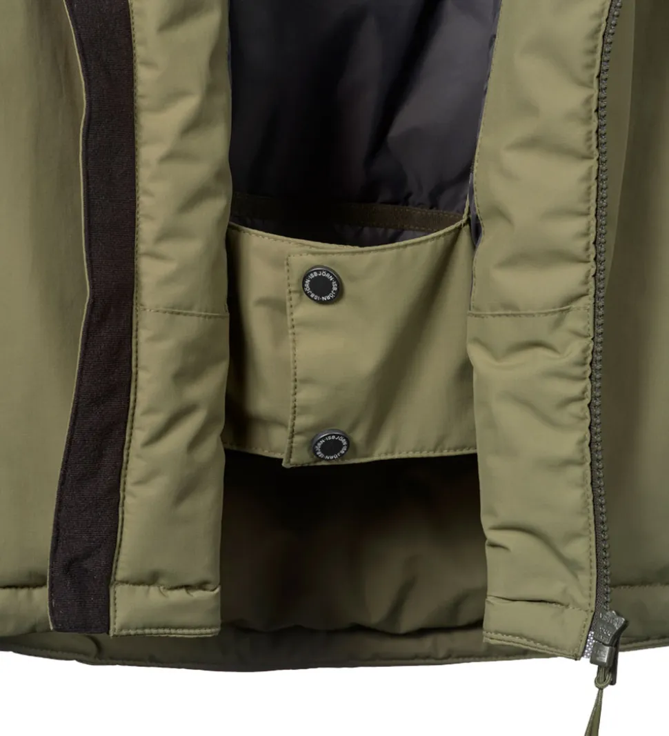 Ærmernes åbninger har praktiske elastikkanter, der kan strammes ind med velcroremme, og snefang med brede, elastiske kanter. På venstre overarm er der en lynlåslomme.