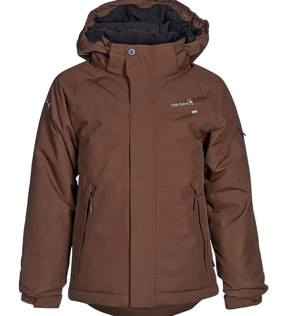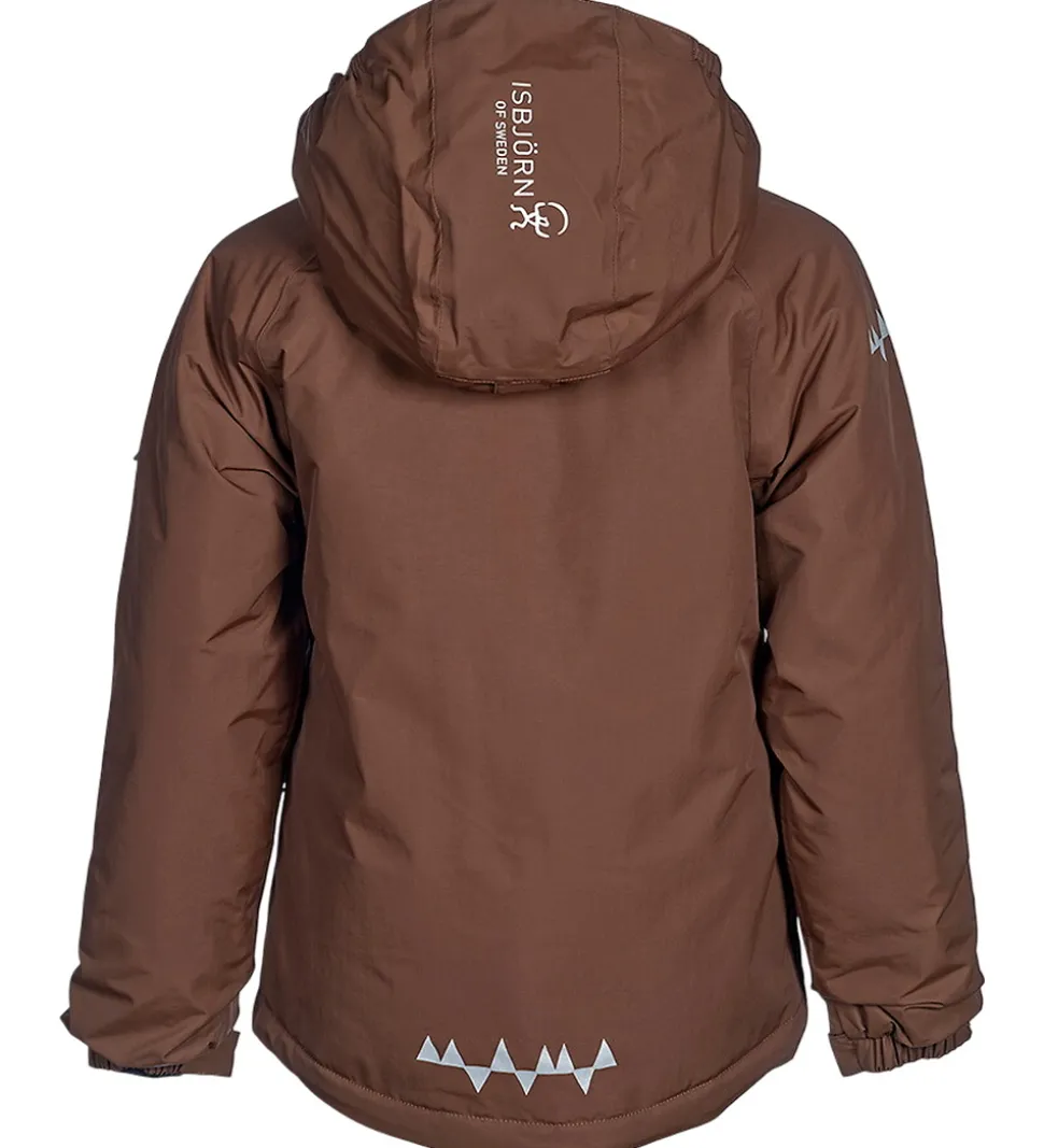 Flot Isbjörn Of Sweden vinterjakke i brun. Vinterjakken har hvide logoprint på venstre bryst og hætten samt smarte refleksprint på lænden og højre skulder.