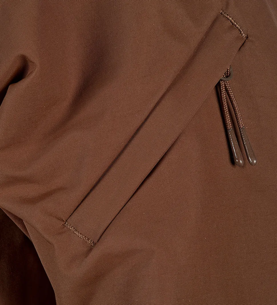 Ærmernes åbninger har praktiske elastikkanter, der kan strammes ind med velcroremme, og snefang med brede, elastiske kanter. På venstre overarm er der en lynlåslomme.