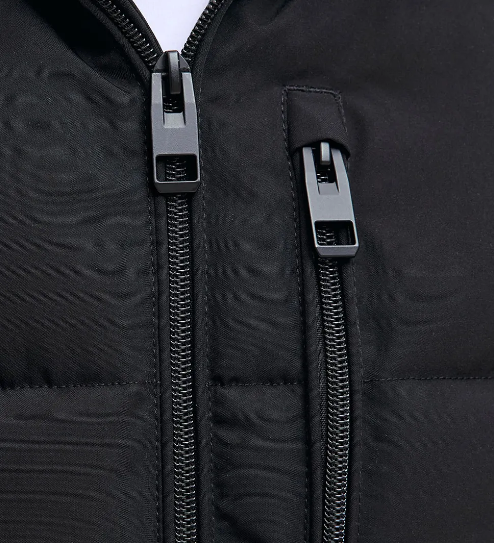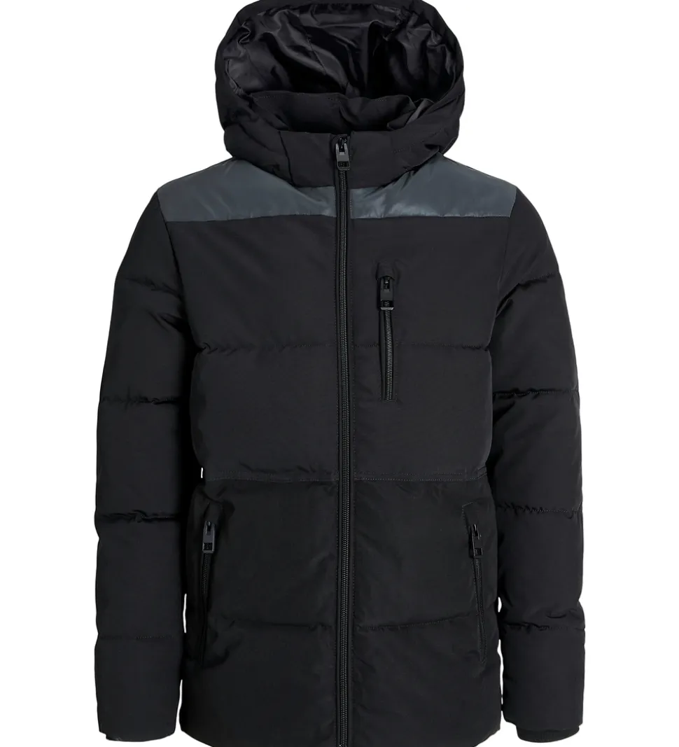 Stilren Jack & Jones dynejakke i sort og refleks. Dynejakkens struktur omfatter vandrette syninger, der giver et moderne udtryk.