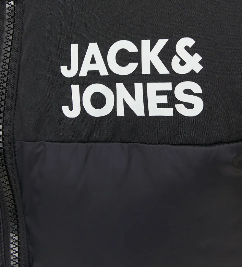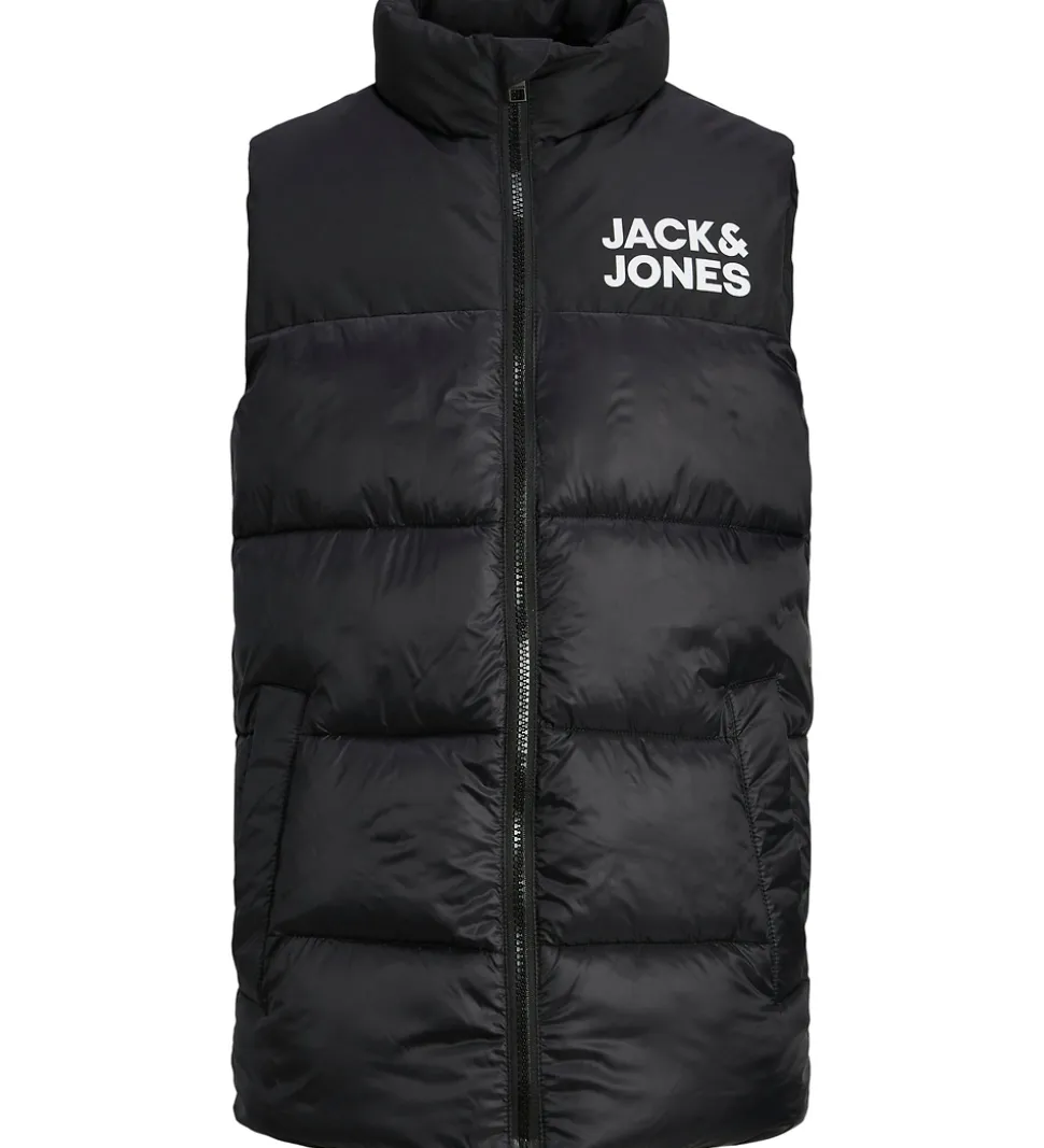 Smart Jack & Jones dynevest i sort med et hvidt Jack & Jones logoprint på brystet. Dynevesten har vandrette syninger og en mellemhøj krave. Den lukkes fortil med gennemgående lynlås med hagebeskytter, og fortil er der en åben lomme i hver side. Indvendigt er der glatvævet for.
