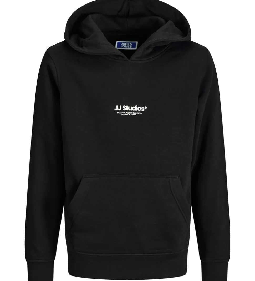Stilfuld hættetrøje fra Jack & Jones i klassisk sort. Hættetrøjen har et minimalistisk design med et lille, hvidt print på brystet, hvor der står “JJ Studios”. Jack & Jones hættetrøjen er forsynet med en rummelig kængurulomme foran samt elastiske ribkanter ved håndleddene og i livet.