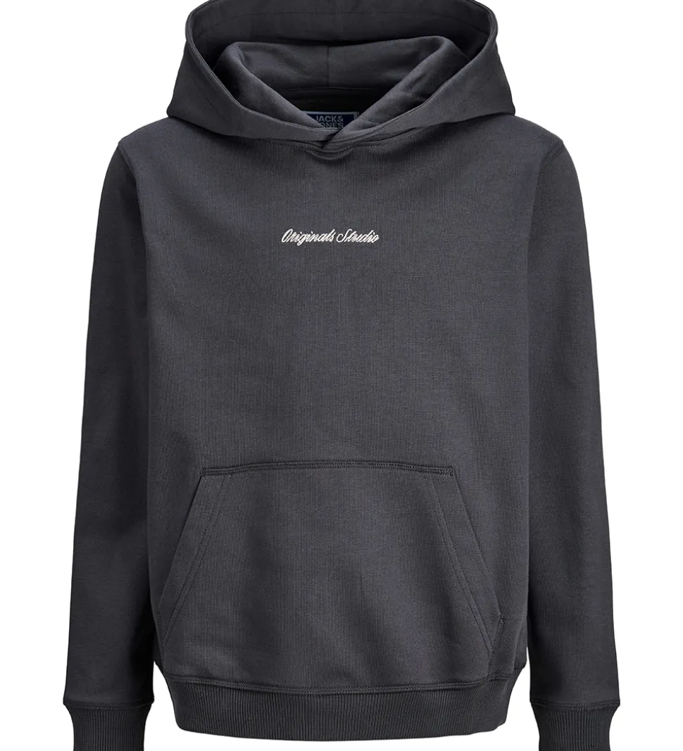 Stilfuld hættetrøje fra Jack & Jones i en klassisk mørkegrå nuance med teksten “Originals Studio” broderet på brystet. Hættetrøjen har en blød hætte og en rummelig kængurulomme. Den har ribkanter ved alle åbninger, og indvendigt er der blødt, børstet bomuld.