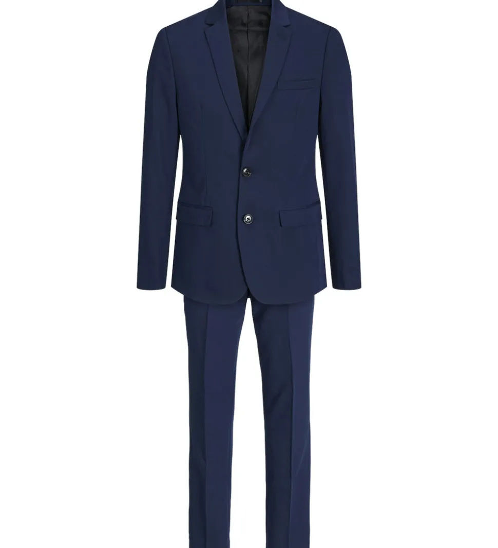 Elegant Jack & Jones jakkesæt i en dyb blå nuance med klassisk design. Jakkesættet omfatter en blazer med to knapper og matchende bukser, perfekt til festlige lejligheder.