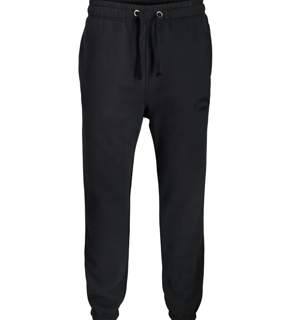 Lækre Jack & Jones sweatpants i sort med et diskret logoprint på venstre lår. Sweatpantsene har en elastisk talje, som kan justeres med snører fortil. I siderne er der praktiske lommer, og i benåbningerne er der brede ribkanter. Indvendigt er der blødt, børstet bomuld.