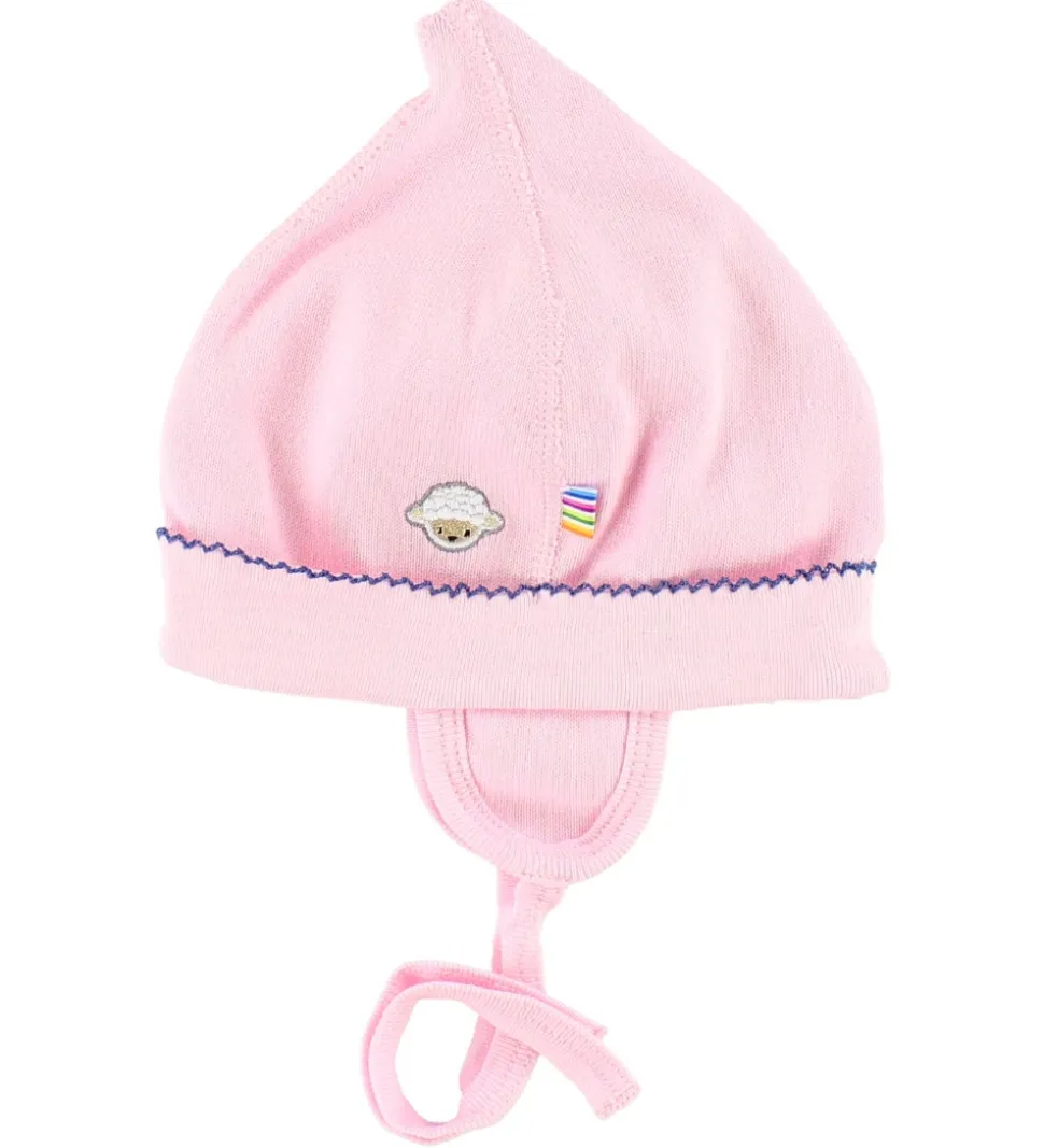 Sød Joha hjelm i lyserød med et broderet får og en blå blondekant.