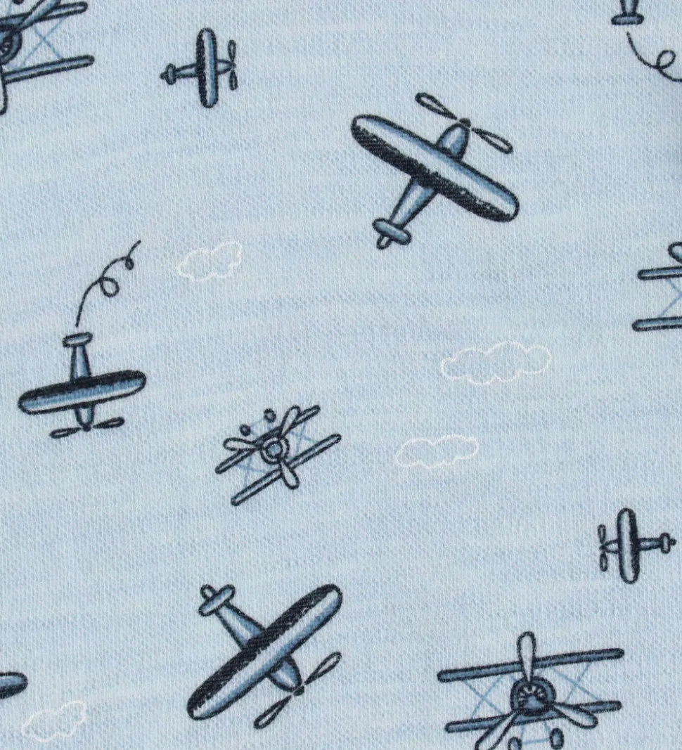 Elegant Joha elefanthue i lyseblå med et fint print af flyvemaskiner og små skyer. Joha elefanthuen har en rund hovedform og er detaljeret med en enkel kant. Elefanthuen har en praktisk split-effekt i bunden, hvilket giver et godt fit omkring halsen.