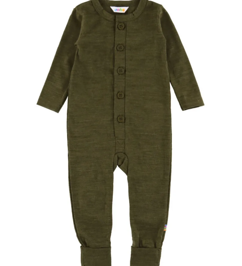 Joha heldragten er udstyret med lange ærmer og ben. Foran lukkes dragten med praktiske knapper, der strækker sig fra hals til ben. Den har opsmøg ved ærmer og ben for en fleksibel pasform og ekstra længde.