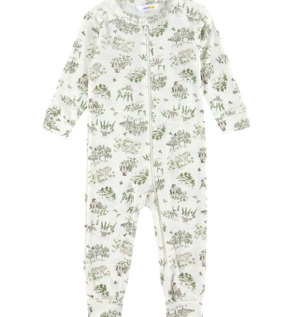 Elegant Joha heldragt med et delikat naturprint i grønne nuancer. Basisfarven er en lys creme, der fremhæver de detaljerede mønstre af træer og dyr.