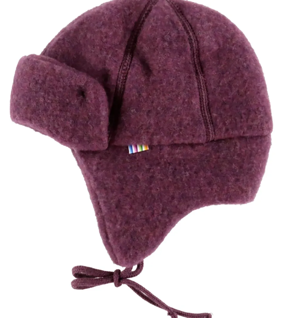 Blød Joha hue i en dyb, lilla nuance med en ensartet struktur. Huen er designet med øreklapper og snører under hagen for sikker pasform. I toppen af ansigtsåbningen er der en fast ombukket skygge.