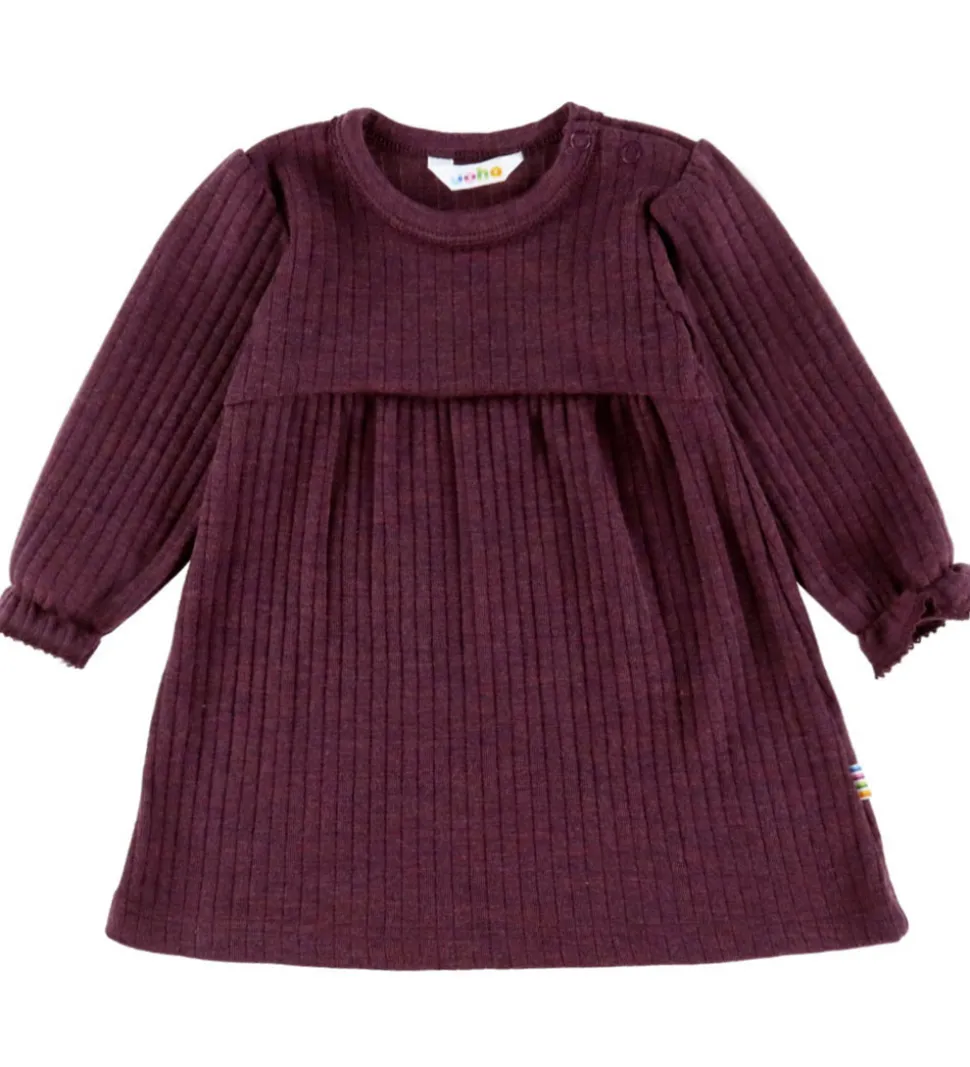 Flot Joha kjole i en dyb, lilla farve. Joha kjolen har en fin, ribbet struktur, der giver et elegant udtryk. Kjolen har lange ærmer med elastiske kanter og knaplukning ved skulderen.