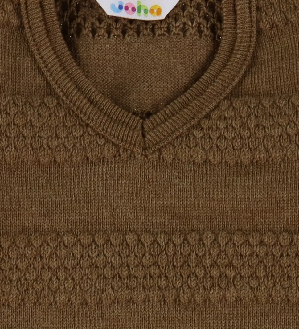 Flot Joha kjole i brun strik med stribet struktur. Kjolen har en enkel v-udskæring og lange ærmer. Den er lavet i blødt merinould.