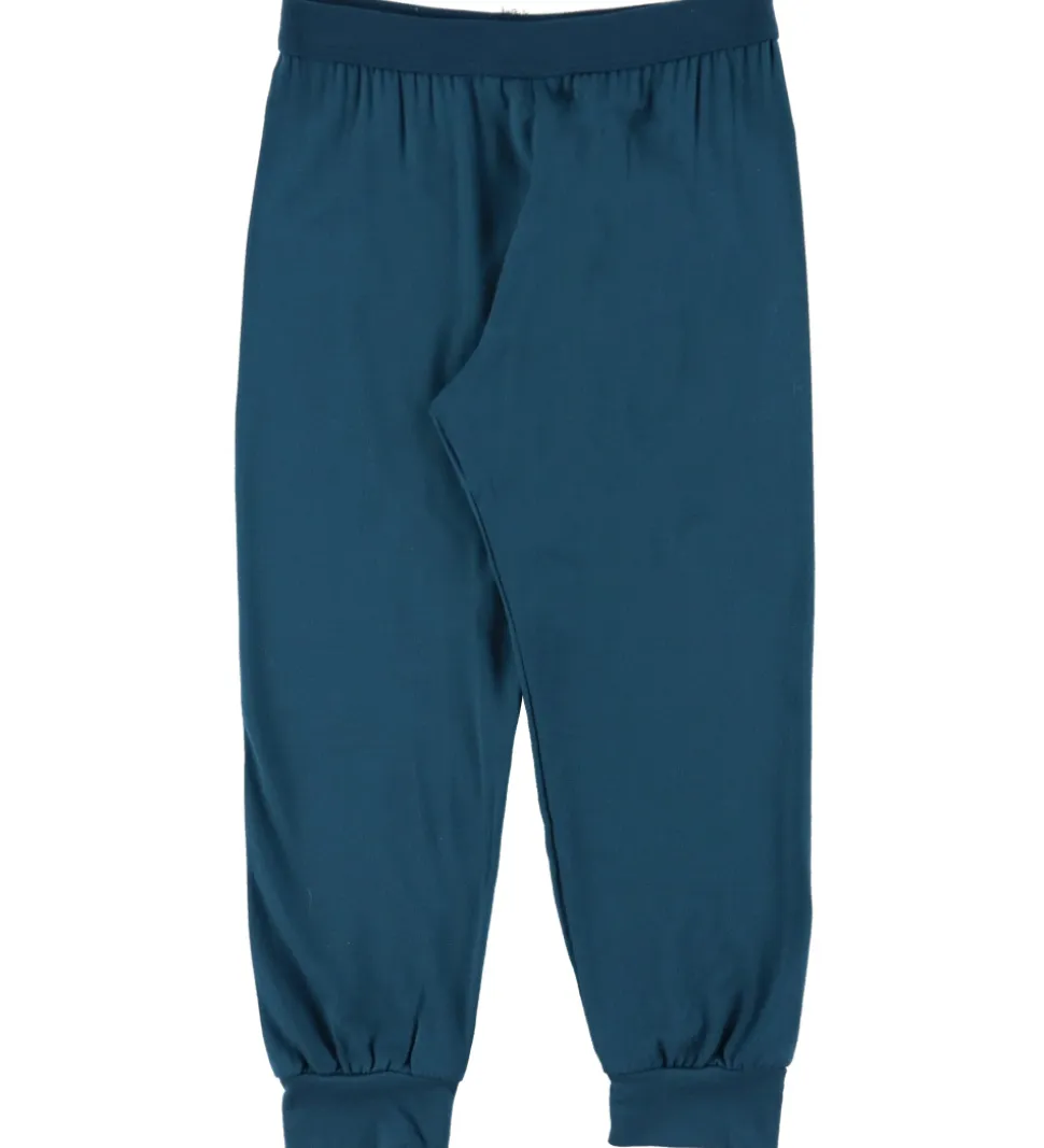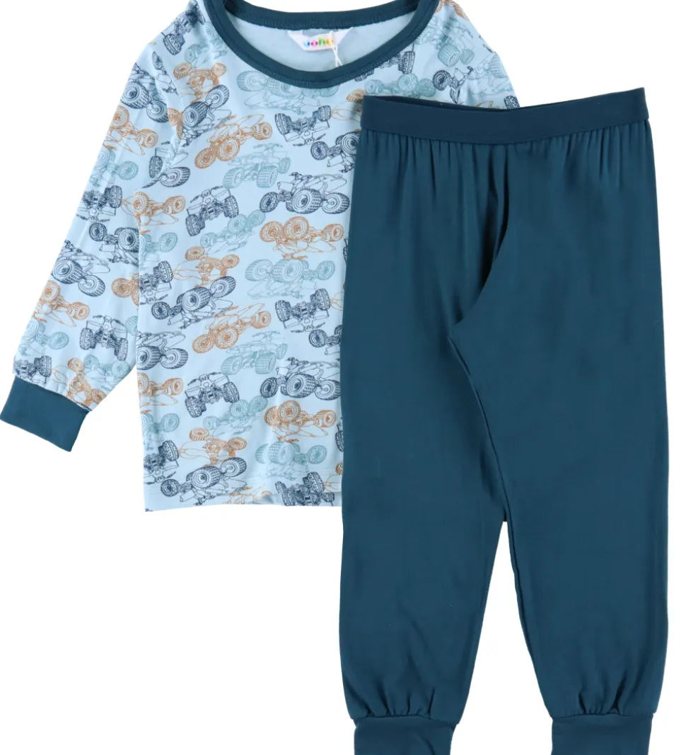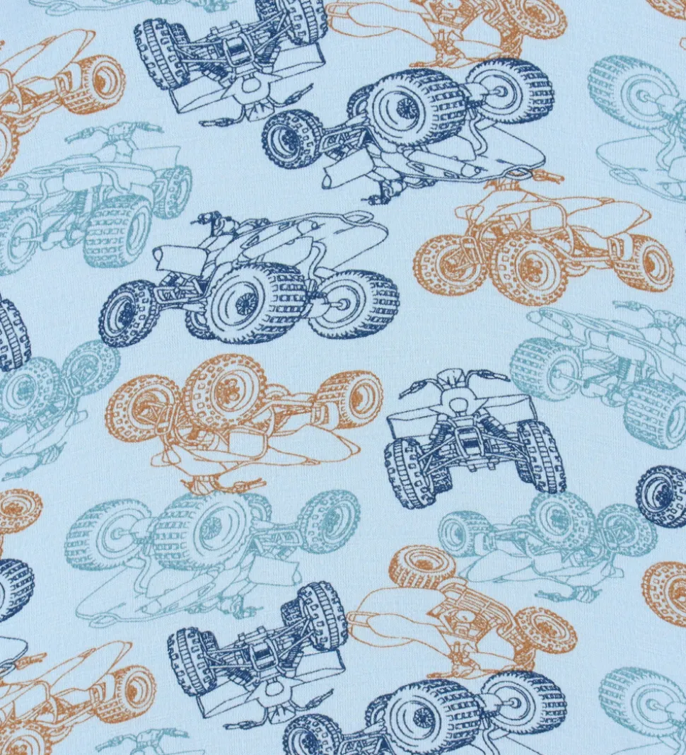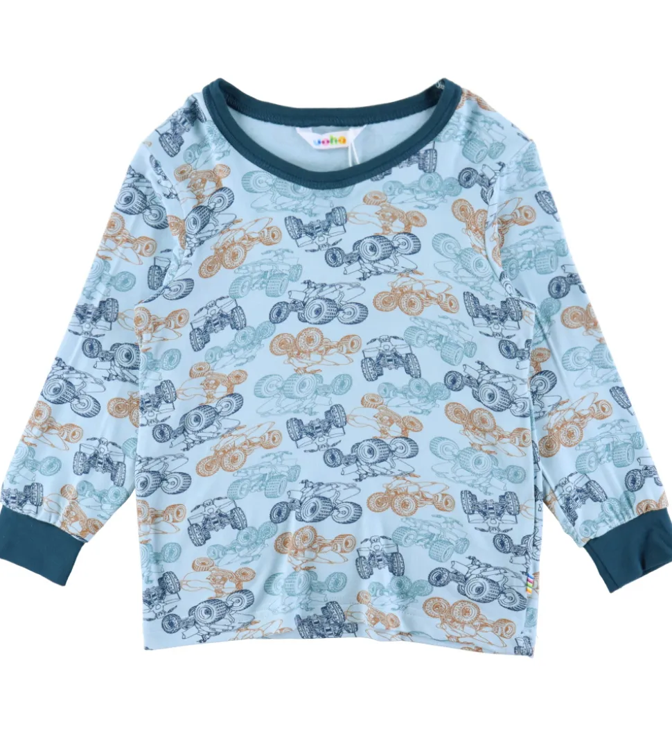 Lækker Joha nattøj bestående af en langærmet bluse og et par natbukser. Blusen er lyseblå med et alloverprint af ATV’er i blå og orange nuancer og kanter i petroliumsblå. Den har en rund halsudskæring og lange ærmer med brede kanter. Natbukserne er ensfarvet petroliumsblå med en god elastik i taljen og brede kanter i benåbningerne.