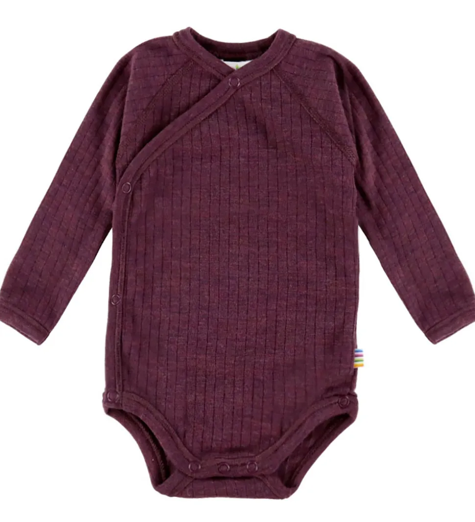 Flot Joha slå-om body i en dyb, lilla farve med en diskret ribstruktur. Slå-om bodyen har lange ærmer og en praktisk slå-om lukning med trykknapper langs siden og i bunden.