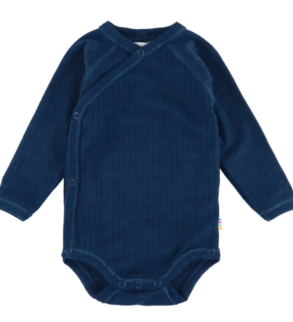 Elegant Joha slå-om body med lange ærmer i en dyb, mørkeblå farve. Slå-om bodyen har en enkelt, men stilfuld ribstruktur, som tilføjer et diskret mønster.
