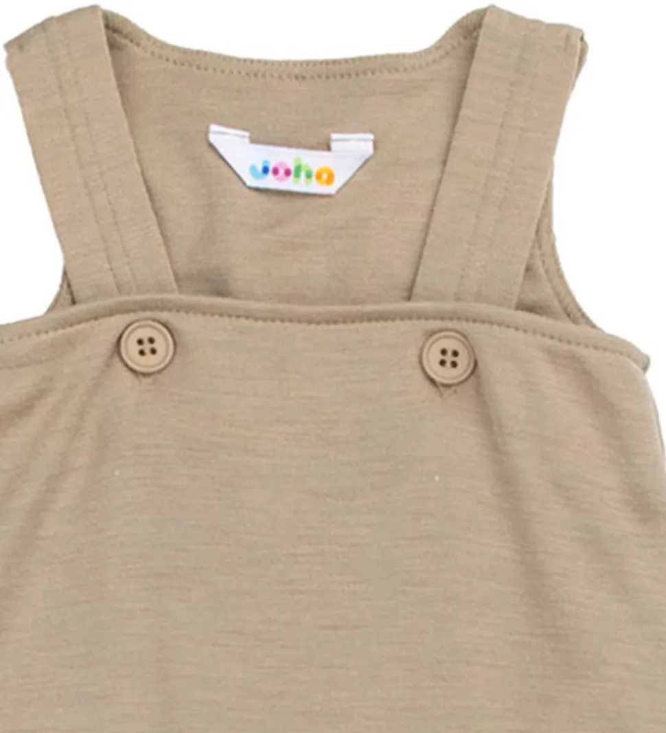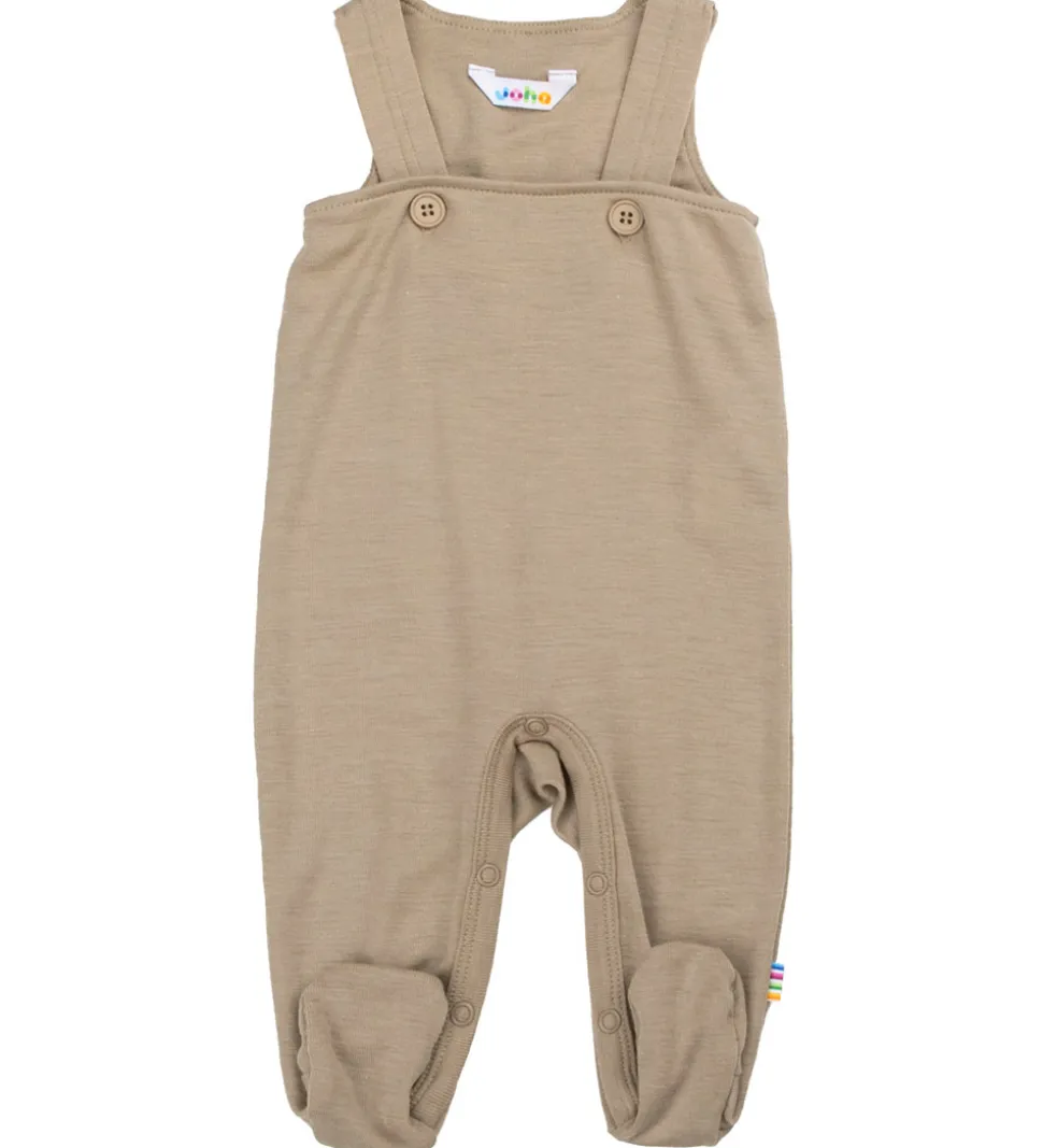 Joha sparkedragten har ingen ærmer, men lange ben med faste fødder. Dragten har en høj ryg med brede skulderstropper, som fæstnes fortil med knapper med to indstillinger. Derover er der trykknapper mellem benene, så der kan åbnes helt op ved bleskift. Den er fremstillet i en blød og lækker blanding af silke og uld.