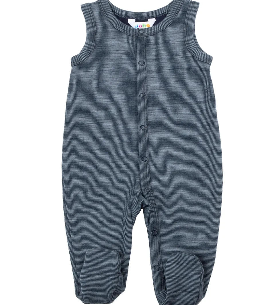 Joha sparkedragten er uden ærmer og har en praktisk knaplukning foran, der går hele vejen ned langs benene, hvilket gør det nemt at tage sparkedragten af og på. Der er en smal ribkant ved ærme- og halsåbningen for ekstra komfort og de integrerede fødder, sørger for at små fødder holdes varme.