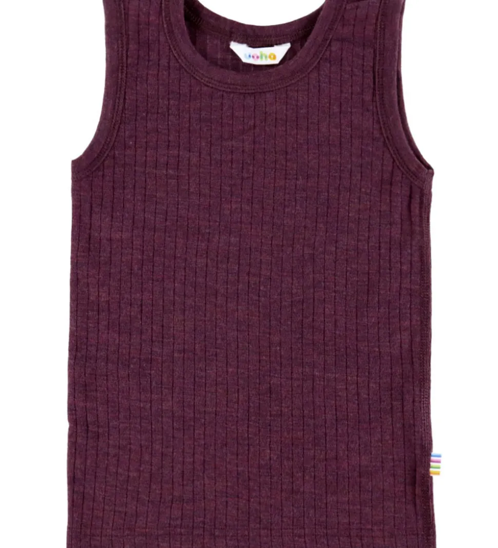 Elegant Joha undertrøje med en dyb, lilla farve. Undertrøjen har et klassisk ribstrikket mønster, der giver en flot struktur. Det ermløse design har et enkelt og stilrent udtryk med en lille, diskret mærke på siden med farvede striber.