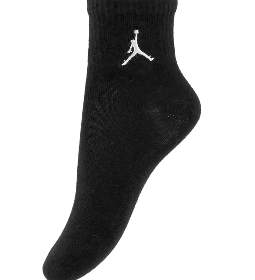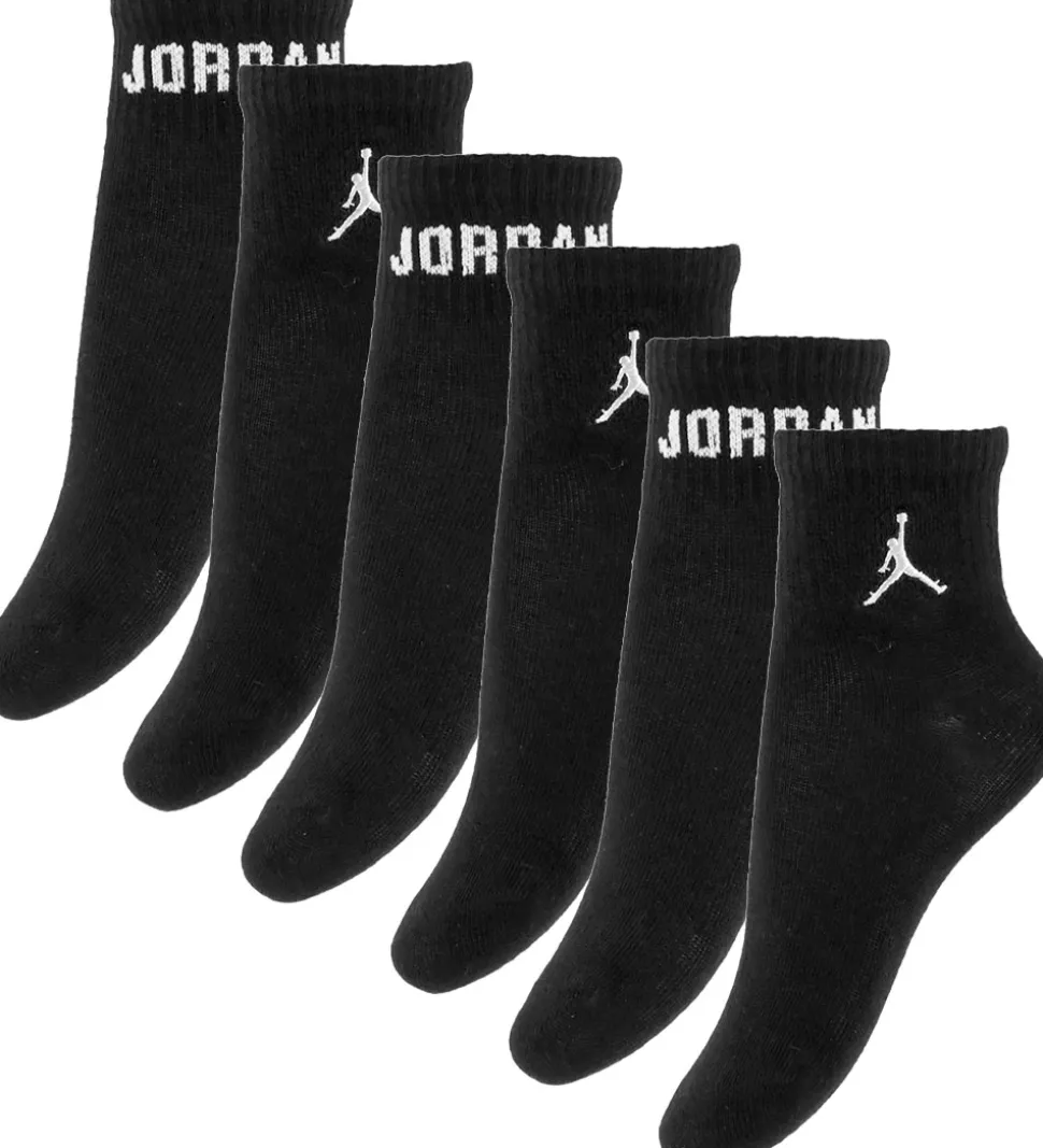 Praktiske Jordan ankelstrømper solgt i en sampak med seks par i sort og med forskellige hvide detaljer. Ankelstrømperne har et kort skaft med en smal ribkant.