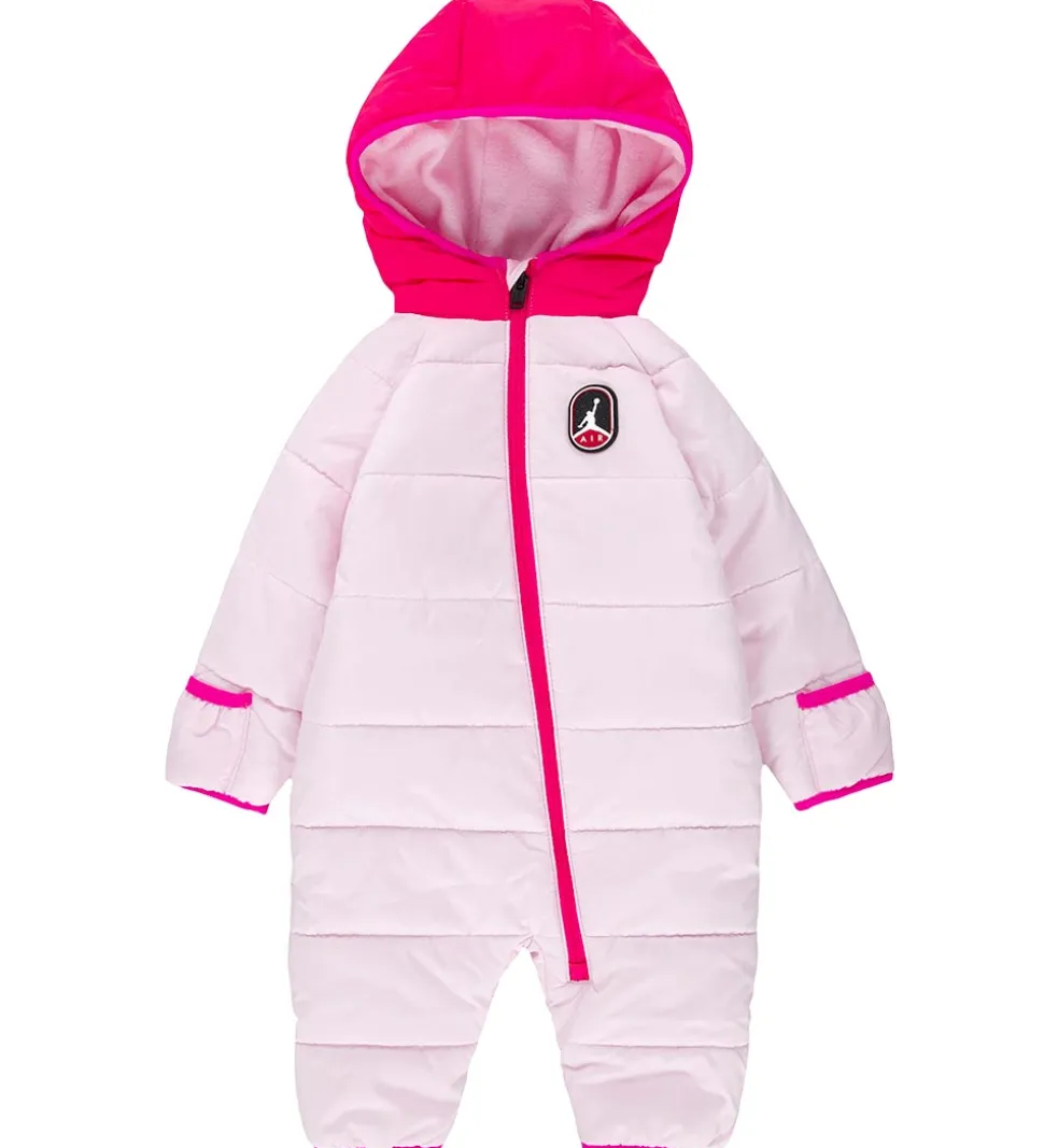 Lækker Jordan flyverdragt i rosa og pink med vandrette syninger, så det bliver en dynedragt. På venstre bryst er der en gummi-logoapplikation, mens der på hætten er et logoprint.