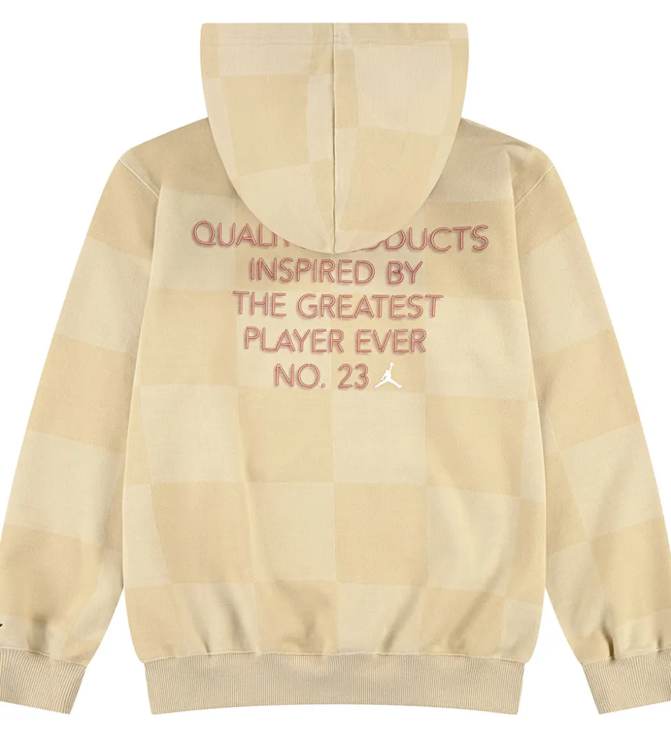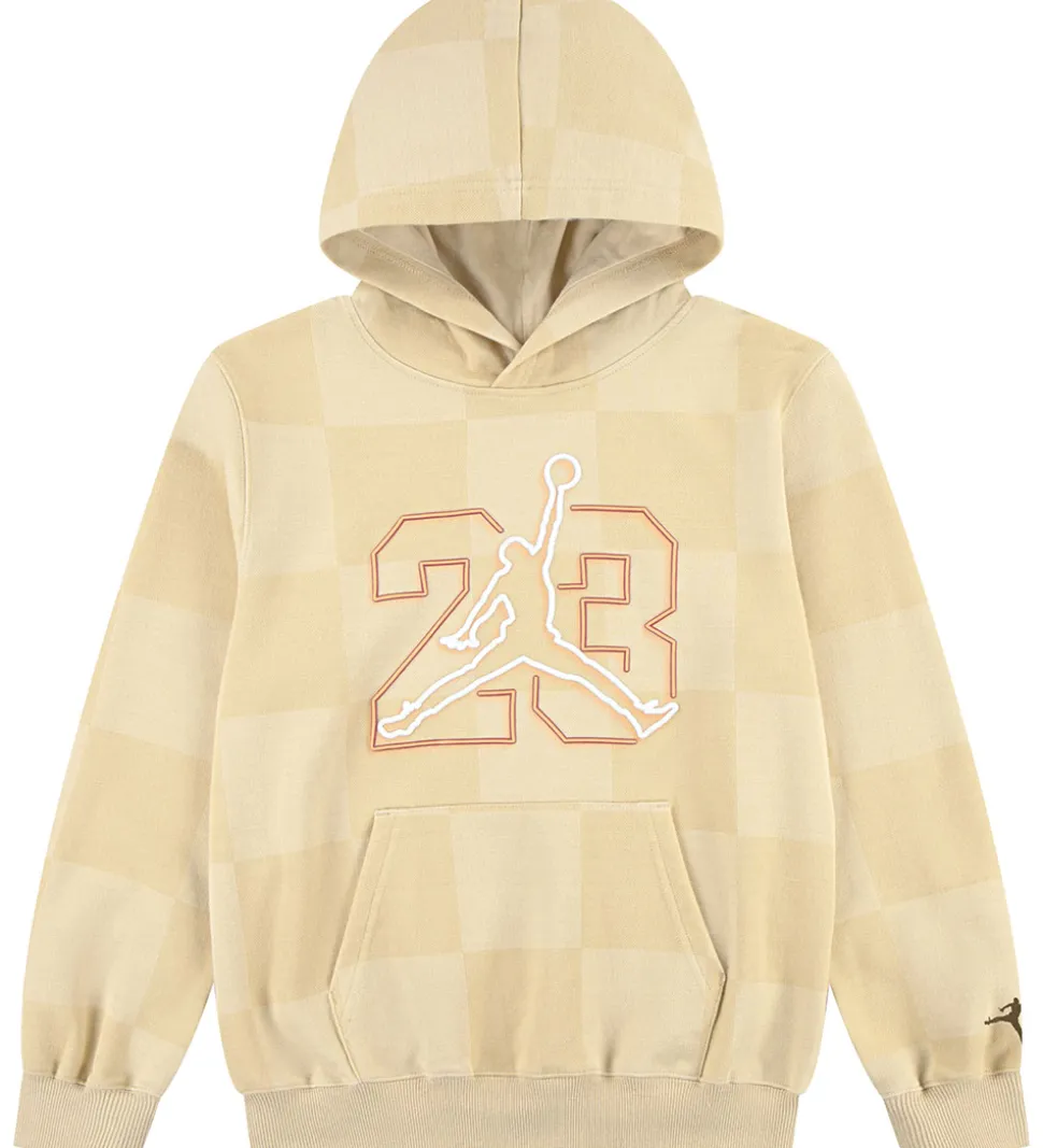 Smart Jordan hættetrøje i lys beige med et diskret ternet mønster, og fortil er der trykt et stort, hvidt logo samt tallet “23” i neonorange med røde kanter, og på ryggen er der et stort tekstprint i neonorange med røde detaljer.