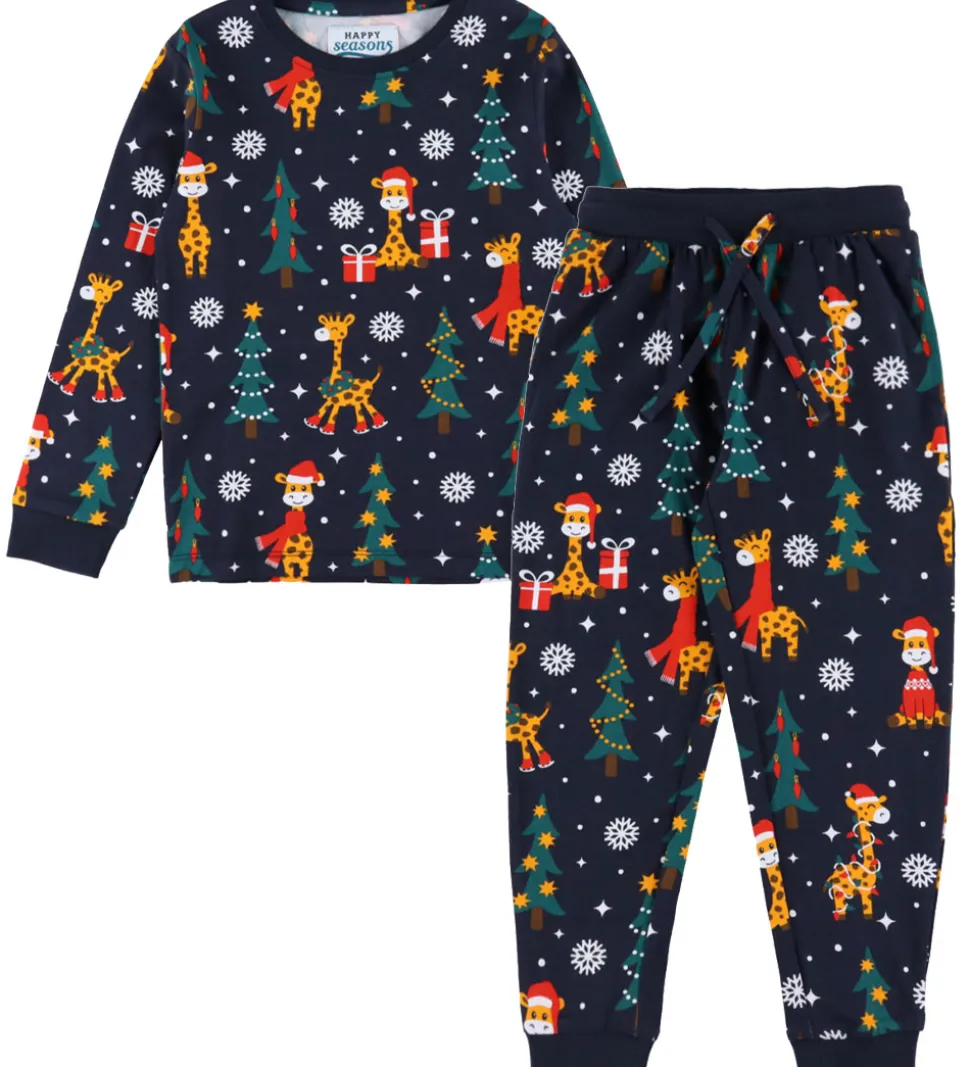 Skønt Jule-Sweaters nattøj i navyblå med et allover-juleprint. Nattøjet består af en bluse med en rund halsudskæring og lange ærmer. Den har en smal ribkant i halsen og brede ribkanter i ærmerne. Natbukserne har en bred elastik i talejn, og kan justeres med snører fortil. I benåbningerne er der brede ribkanter.