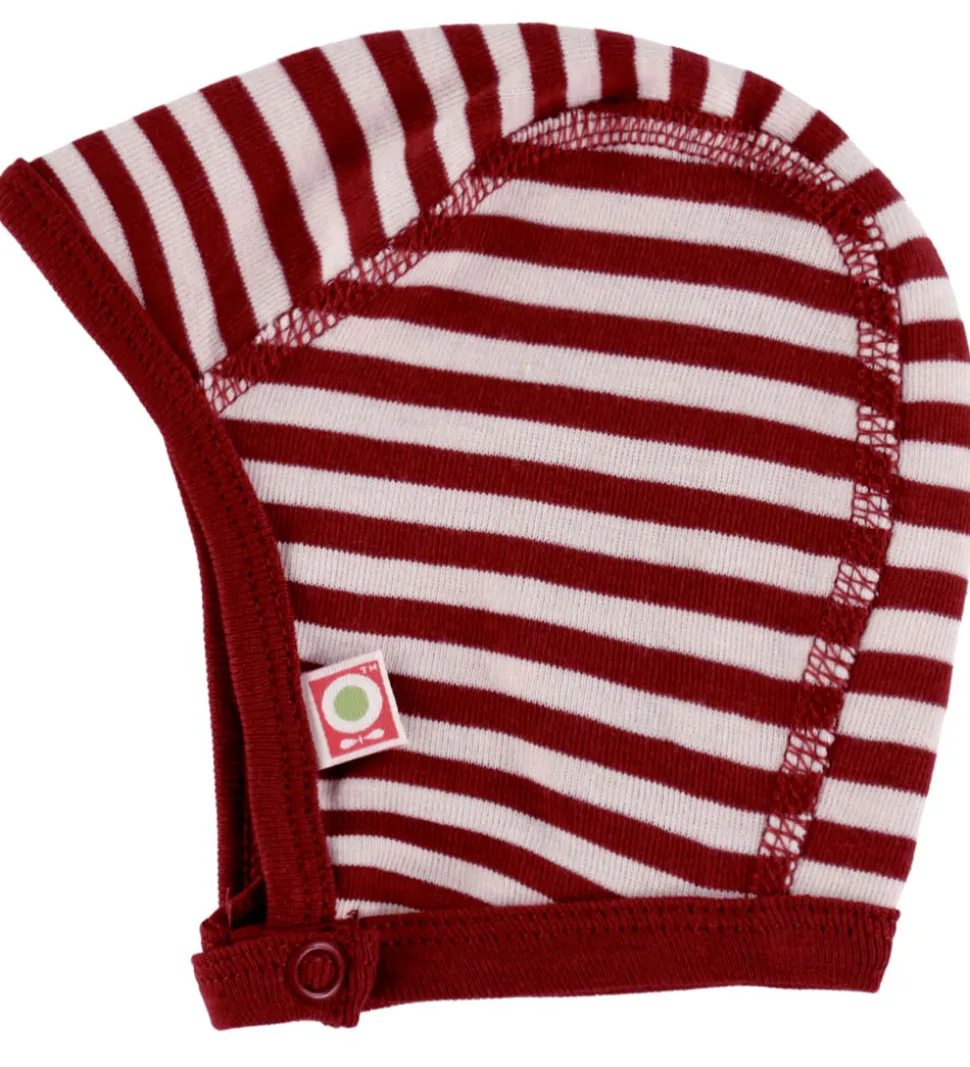Charmerende Katvig babyhjelm med vandrette striber i rød og hvid. Babyhjelmen har en rund hovedform og er udstyret med en smal kant langs åbningen. Den lukkes under hagen med en trykknap med to indstillinger.