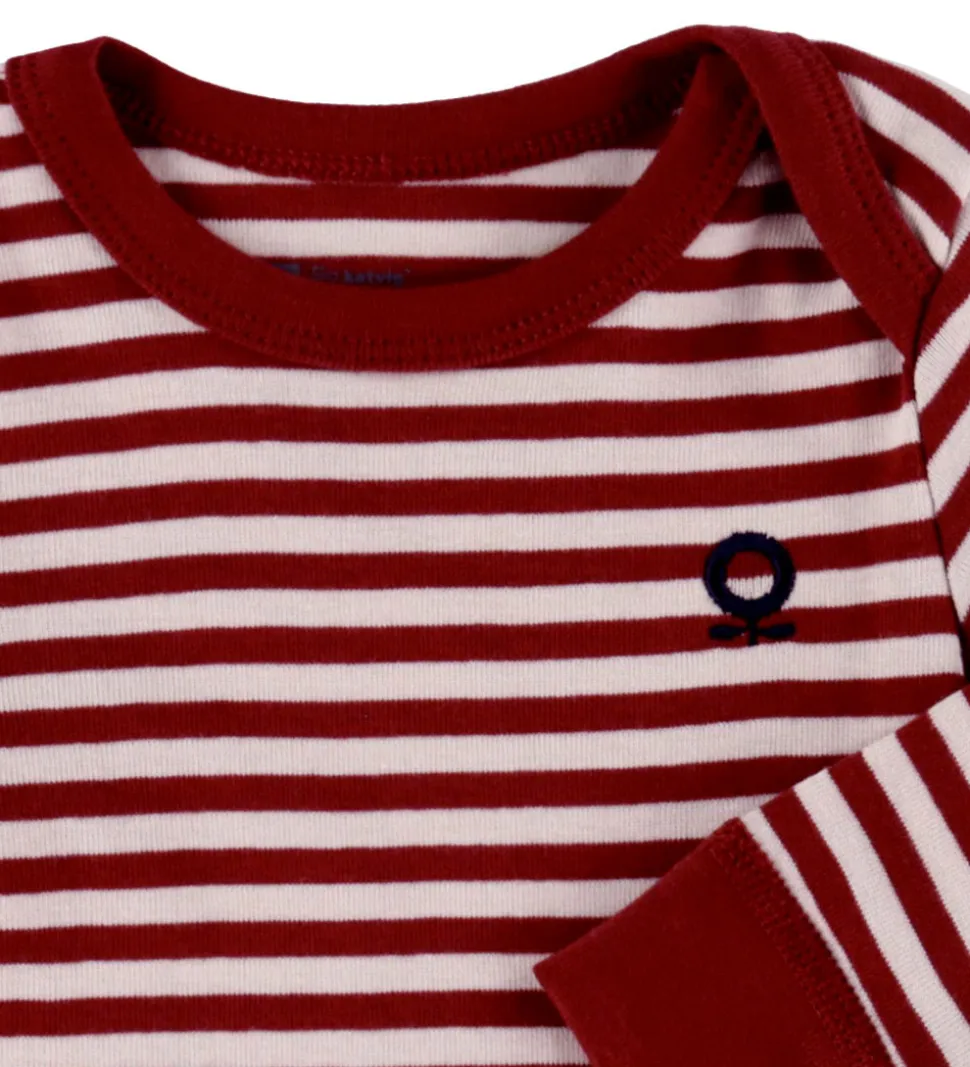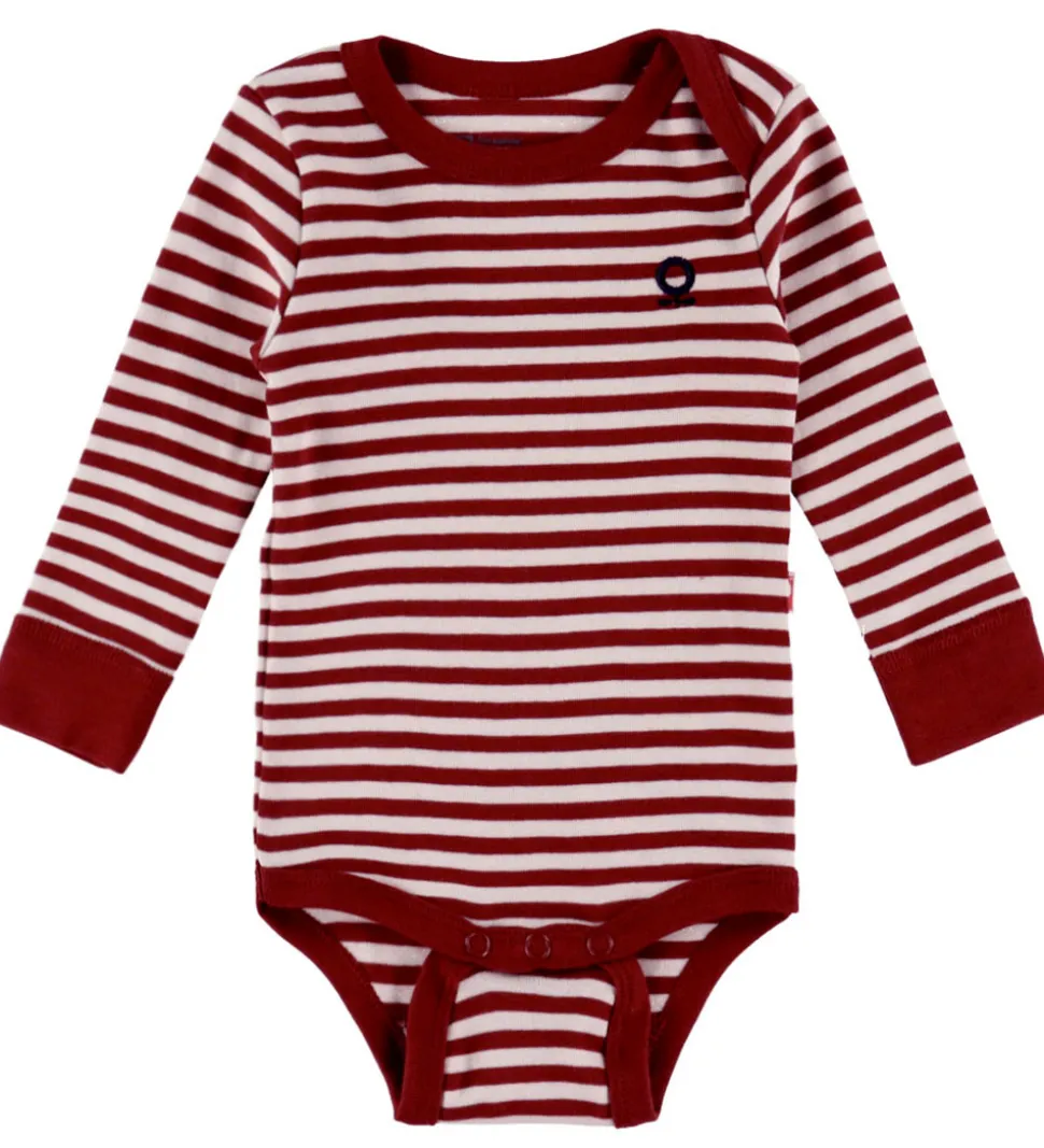 Lækker Katvig body med stribet design i rød og hvid. På venstre bryst er der broderet et lille logo i navyblå. Bodyen har en rund halsudskæring med foldeskulder i den ene side. Den har lange ærmer med brede ribkanter, og lukkes mellem benene med trykknapper.