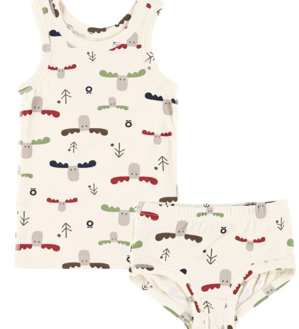 Charmerende Katvig undertøj bestående af en undertrøje og et par trusser i råhvid med alloverprint af elgehoveder og logoer i forskellige farver. Undertrøjen har brede skulderstropper og en rund halsudskæring. Trusserne har en god elastik i livet, som sikrer en god pasform. Undertøjet er fremstillet af bambus viskose.