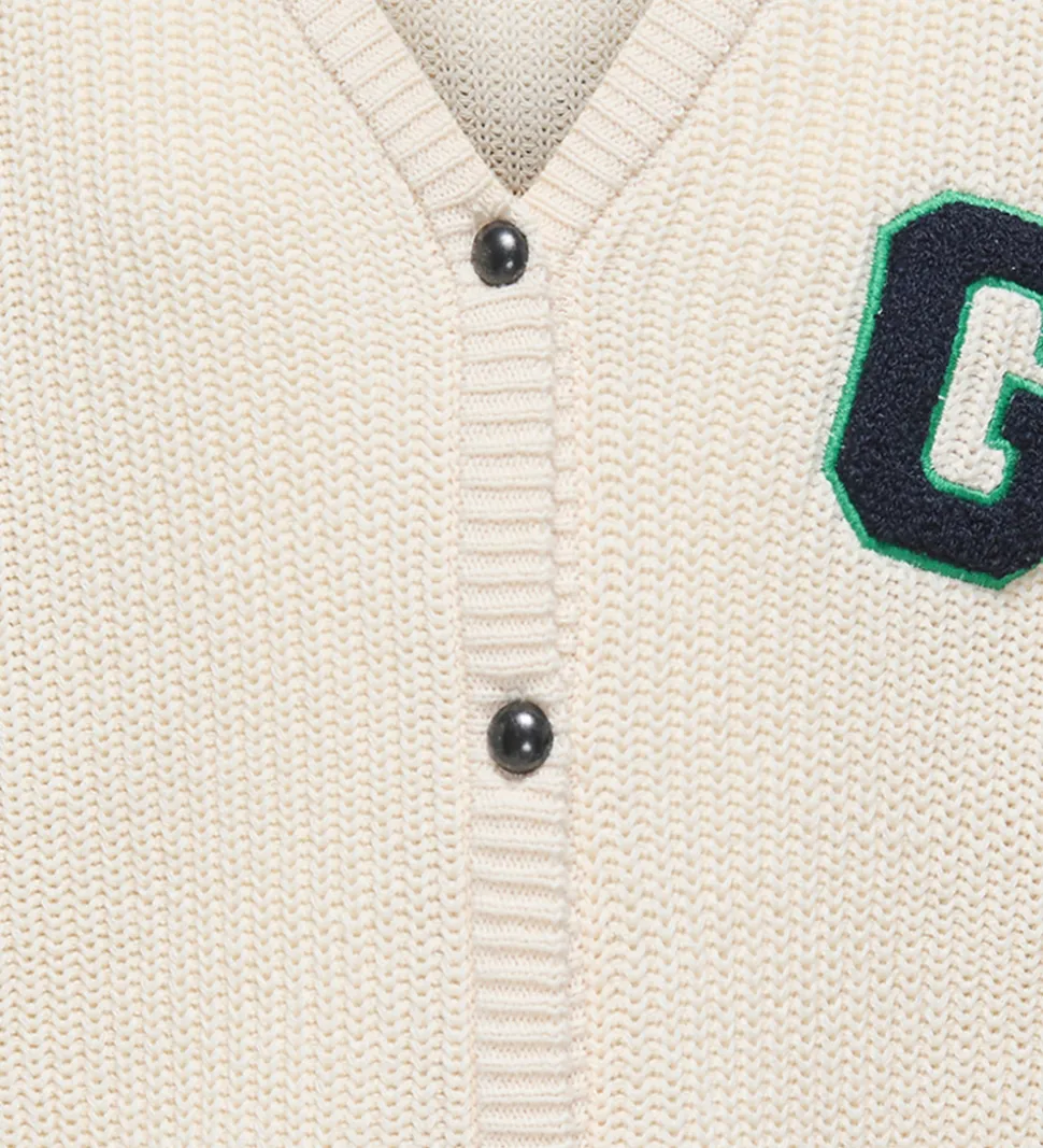 Flot Kids Only cardigan strikket i en lys cremefarve. Cardiganen har lange ærmer og en markant mørkegrøn og sort stribet ribkant ved manchetter og bund. På brystet ses et stort påsyet “G” i grønt og sort, som giver cardiganen et sporty udtryk. Knaplukningen i fronten bidrager til en praktisk pasform.