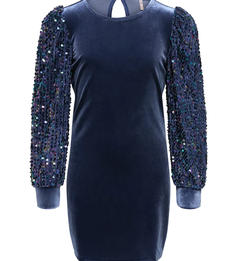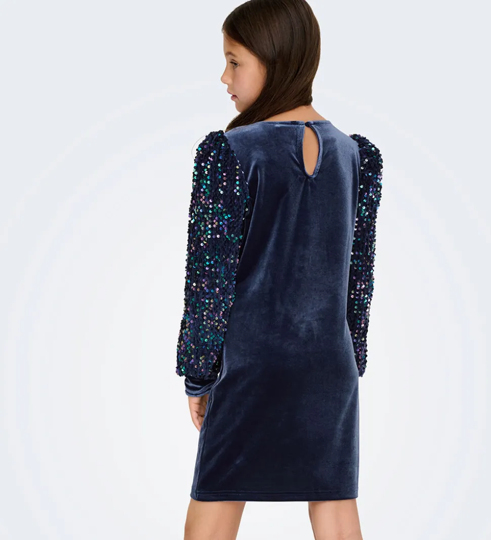 Elegant Kids Only kjole i dyb marineblå velour . Kids Only kjolen har lange ærmer beklædt med farverige pailletter, der giver et funklende udtryk. Kjolen lukkes med en knap i nakken, hvilket giver et rent look.