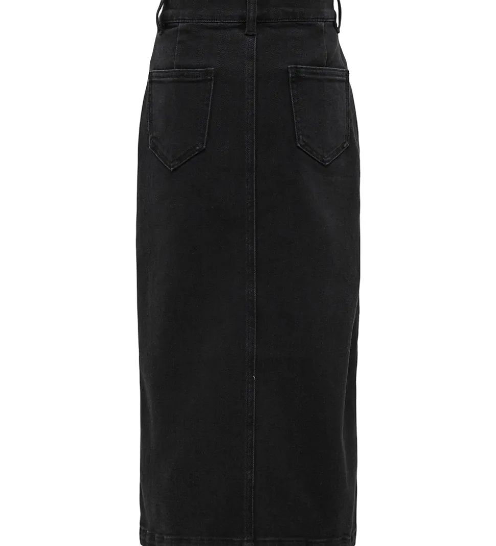 Stilren Kids Only nederdel i klassisk, sort denim. Kids Only nederdelen har en tætsiddende pasform med en praktisk slids foran, samt en hægte- og lynlåslukning i taljen.