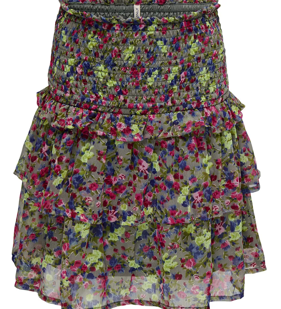 Skøn Kids Only nederdel i grå med et alloverprint af blomster i grønne, blå og rosa nuancer.
